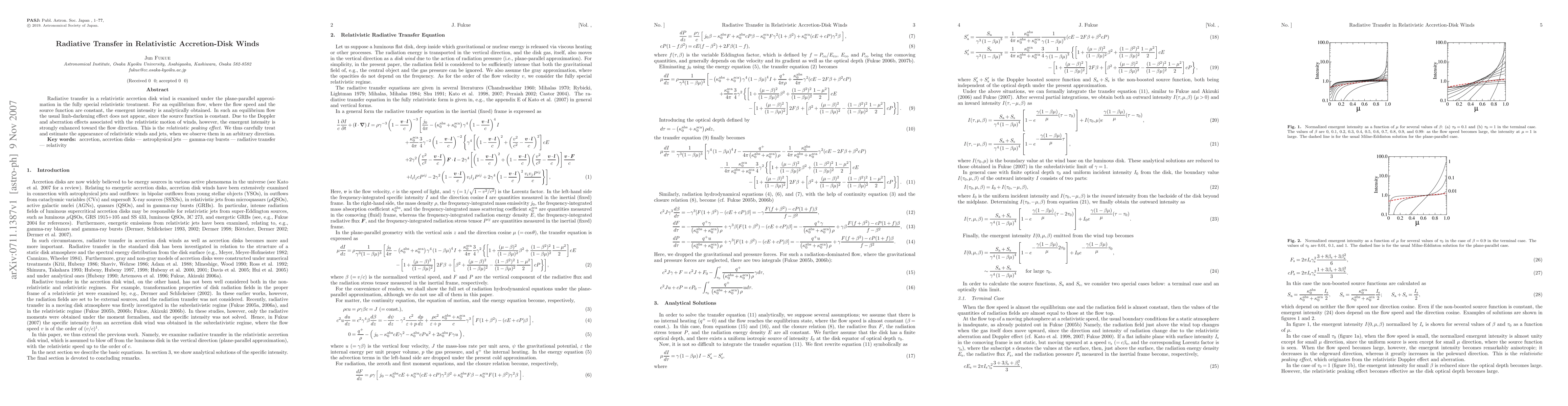 The paper investigates radiative transfer in relativistic accretion disk winds under the plane-parallel approximation and special relativity, deriving the emergent intensity analytically for an equilibrium flow. The study reveals the "relativistic peaking effect," where the intensity is significantly enhanced in the direction of the relativistic wind due to Doppler and aberration effects.