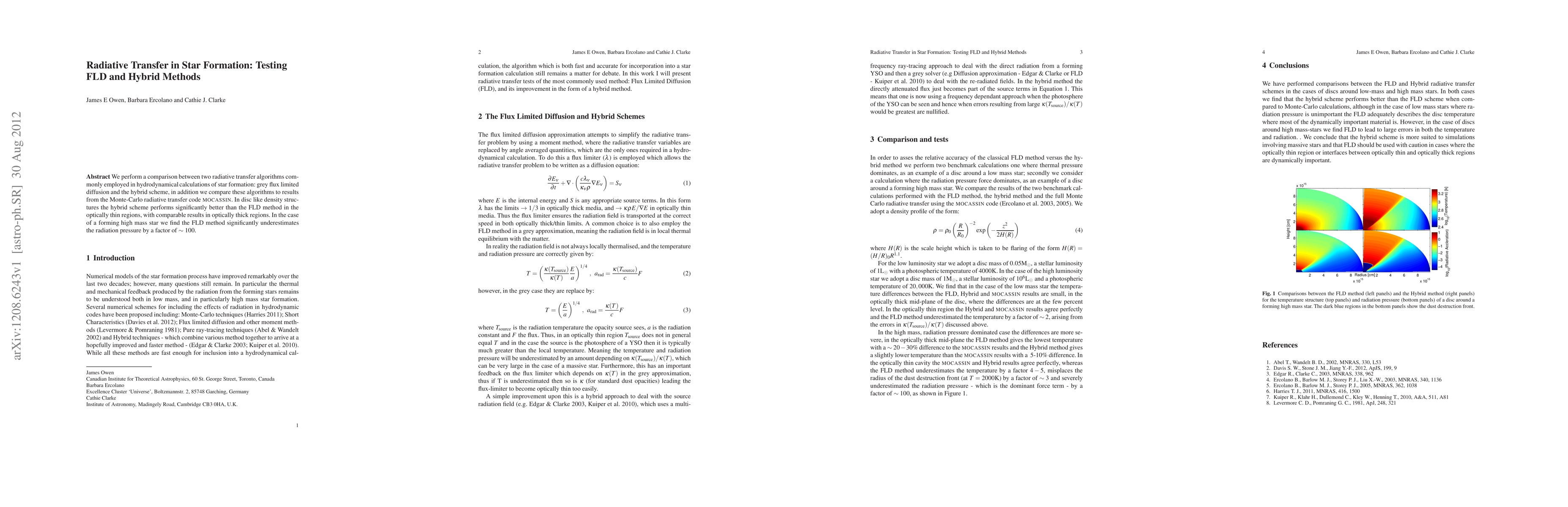 We perform a comparison between two radiative transfer algorithms commonly employed in hydrodynamical calculations of star formation: grey flux limited diffusion and the hybrid scheme, in addition we compare these algorithms to results from the Monte-Carlo radiative transfer code MOCASSIN. In disc like density structures the hybrid scheme performs significantly better than the FLD method in the optically thin regions, with comparable results in optically thick regions. In the case of a forming high mass star we find the FLD method significantly underestimates the radiation pressure by a factor of ~100.