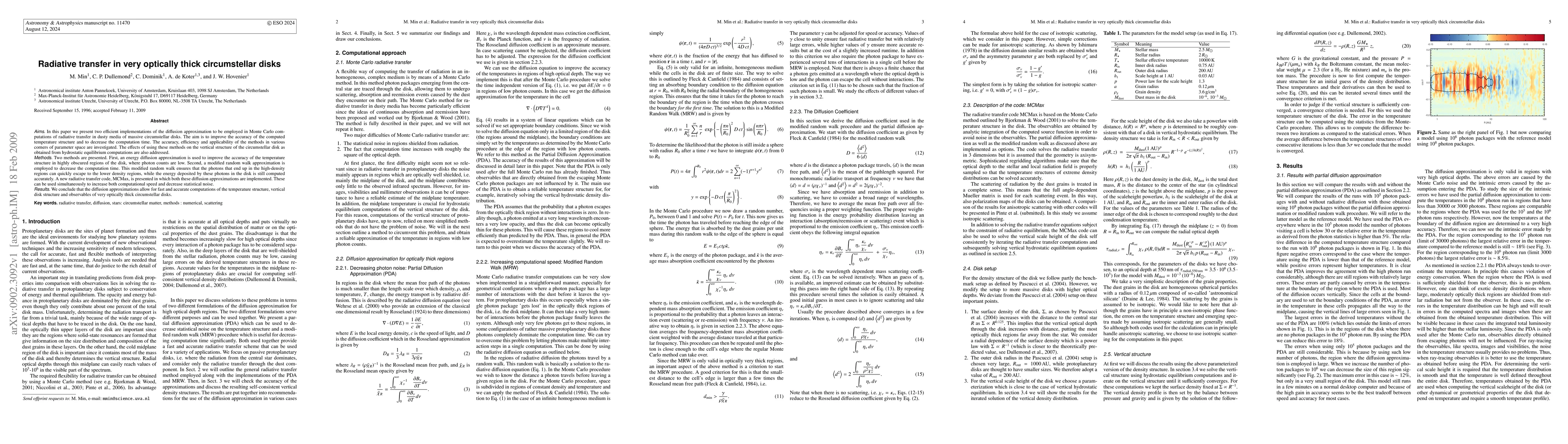 This paper introduces two efficient diffusion approximations for Monte Carlo computations of radiative transfer in massive circumstellar disks, enhancing accuracy and reducing computation time. The new MCMax code implements these methods, enabling faster and more precise modeling of the temperature and vertical structure of very optically thick disks.