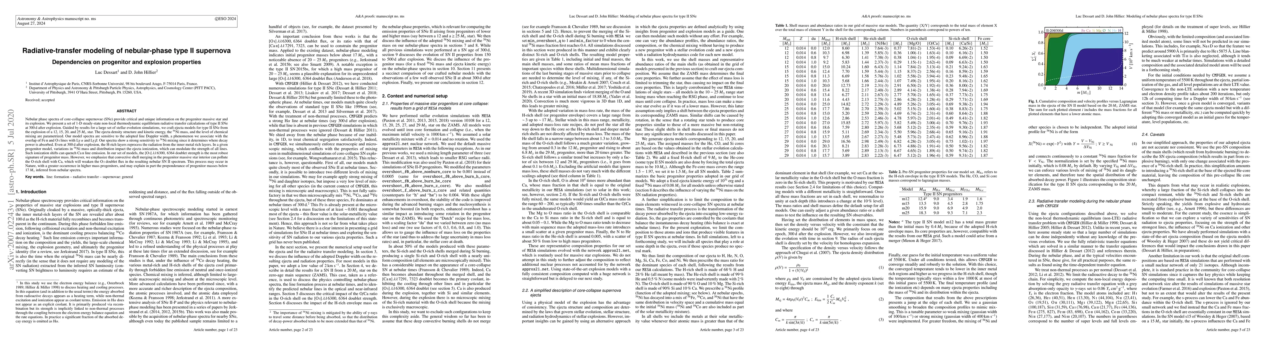 Researchers developed a radiative-transfer model to analyze the spectra of type II supernovae, finding that progenitor mass can be inferred from line strengths, especially in the OI6300 doublet, and that chemical mixing affects the strength of spectral lines.