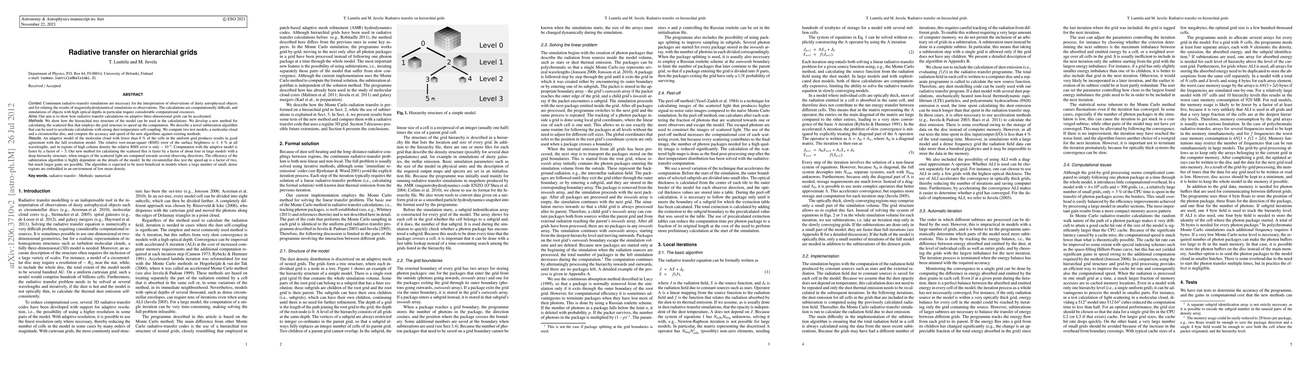 We present new methods for radiative transfer on hierarchial grids. We develop a new method for calculating the scattered flux that employs the grid structure to speed up the computation. We describe a novel subiteration algorithm that can be used to accelerate calculations with strong dust temperature self-coupling. We compute two test models, a molecular cloud and a circumstellar disc, and compare the accuracy and speed of the new algorithms against existing methods. An adaptive model of the molecular cloud with less than 8 % of the cells in the uniform grid produced results in good agreement with the full resolution model. The relative RMS error of the surface brightness <4 % at all wavelengths, and in regions of high column density the relative RMS error was only 10^{-4}. Computation with the adaptive model was faster by a factor of ~5. The new method for calculating the scattered flux is faster by a factor of ~4 in large models with a deep hierarchy structure, when images of the scattered light are computed towards several observing directions. The efficiency of the subiteration algorithm is highly dependent on the details of the model. In the circumstellar disc test the speed-up was a factor of two, but much larger gains are possible. The algorithm is expected to be most beneficial in models where a large number of small, dense regions are embedded in an environment with a lower mean density.