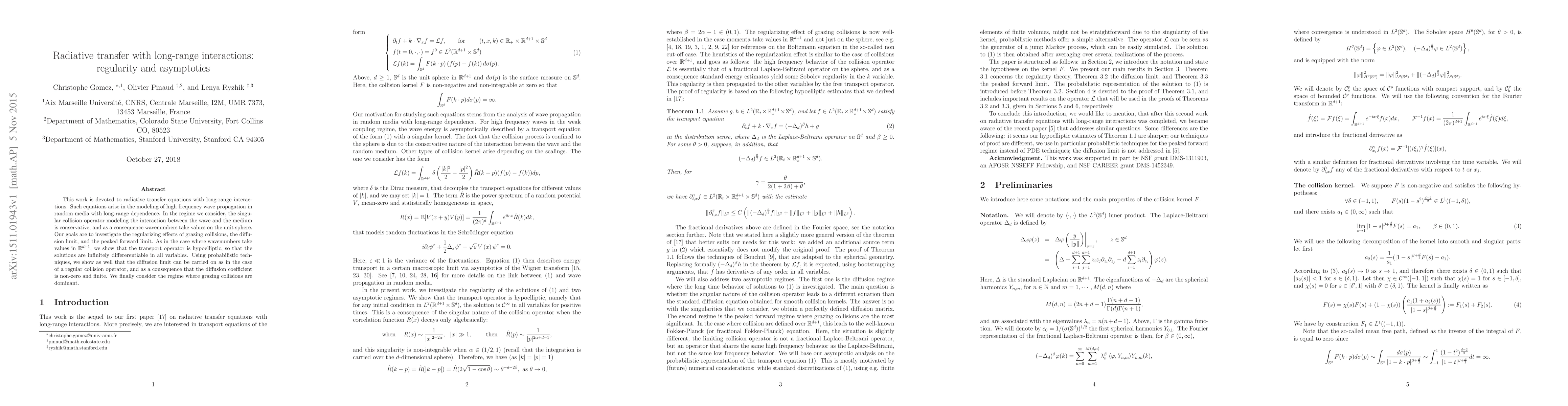 This work is devoted to radiative transfer equations with long-range interactions. Such equations arise in the modeling of high frequency wave propagation in random media with long-range dependence. In the regime we consider, the singular collision operator modeling the interaction between the wave and the medium is conservative, and as a consequence wavenumbers take values on the unit sphere. Our goals are to investigate the regularizing effects of grazing collisions, the diffusion limit, and the peaked forward limit. As in the case where wavenumbers take values in R^{d+1}, we show that the transport operator is hypoelliptic, so that the solutions are infinitely differerentiable in all variables. Using probabilistic techniques, we show as well that the diffusion limit can be carried on as in the case of a regular collision operator, and as a consequence that the diffusion coefficient is non-zero and finite. We finally consider the regime where grazing collisions are dominant.