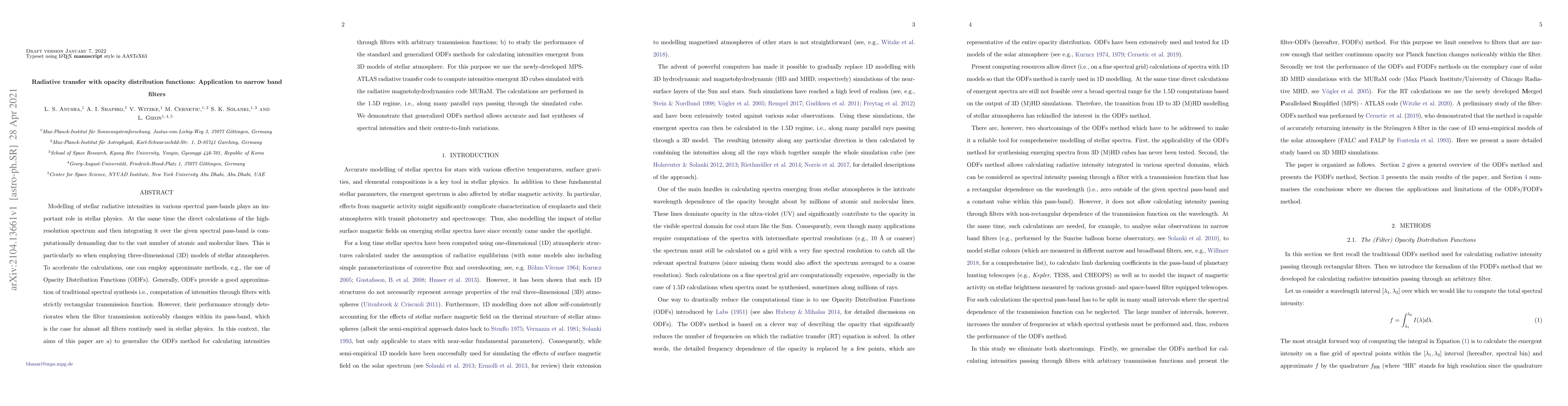 Modelling of stellar radiative intensities in various spectral pass-bands plays an important role in stellar physics. At the same time the direct calculations of the high-resolution spectrum and then integrating it over the given spectral pass-band is computationally demanding due to the vast number of atomic and molecular lines. This is particularly so when employing three-dimensional (3D) models of stellar atmospheres. To accelerate the calculations, one can employ approximate methods, e.g., the use of Opacity Distribution Functions (ODFs). Generally, ODFs provide a good approximation of traditional spectral synthesis i.e., computation of intensities through filters with strictly rectangular transmission function. However, their performance strongly deteriorates when the filter transmission noticeably changes within its pass-band, which is the case for almost all filters routinely used in stellar physics. In this context, the aims of this paper are a) to generalize the ODFs method for calculating intensities through filters with arbitrary transmission functions; b) to study the performance of the standard and generalized ODFs methods for calculating intensities emergent from 3D models of stellar atmosphere. For this purpose we use the newly-developed MPS-ATLAS radiative transfer code to compute intensities emergent 3D cubes simulated with the radiative magnetohydrodynamics code MURaM. The calculations are performed in the 1.5D regime, i.e., along many parallel rays passing through the simulated cube. We demonstrate that generalized ODFs method allows accurate and fast syntheses of spectral intensities and their centre-to-limb variations.