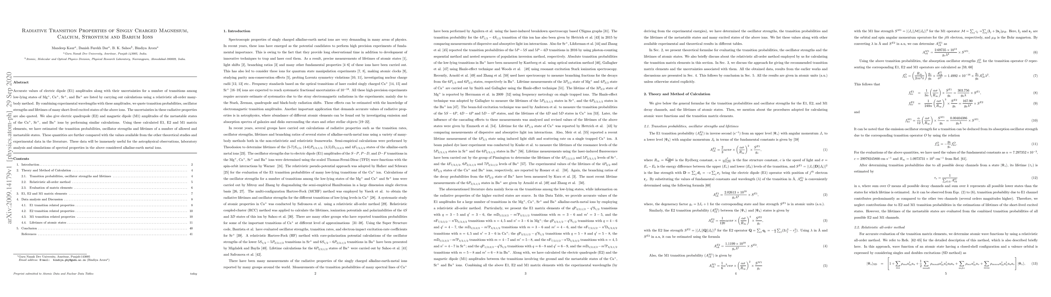 Accurate values of electric dipole (E1) amplitudes along with their uncertainties for a number of transitions among low-lying states of Mg$^+$, Ca$^+$, Sr$^+$, and Ba$^+$ are listed by carrying out calculations using a relativistic all-order many-body method. By combining experimental wavelengths with these amplitudes, we quote transition probabilities, oscillator strengths and lifetimes of many short-lived excited states of the above ions. The uncertainties in these radiative properties are also quoted. We also give electric quadrupole (E2) and magnetic dipole (M1) amplitudes of the metastable states of the Ca$^+$, Sr$^+$, and Ba$^+$ ions by performing similar calculations. Using these calculated E1, E2 and M1 matrix elements, we have estimated the transition probabilities, oscillator strengths and lifetimes of a number of allowed and metastable states. These quantities are further compared with the values available from the other theoretical studies and experimental data in the literature. These data will be immensely useful for the astrophysical observations, laboratory analysis and simulations of spectral properties in the above considered alkaline-earth metal ions.