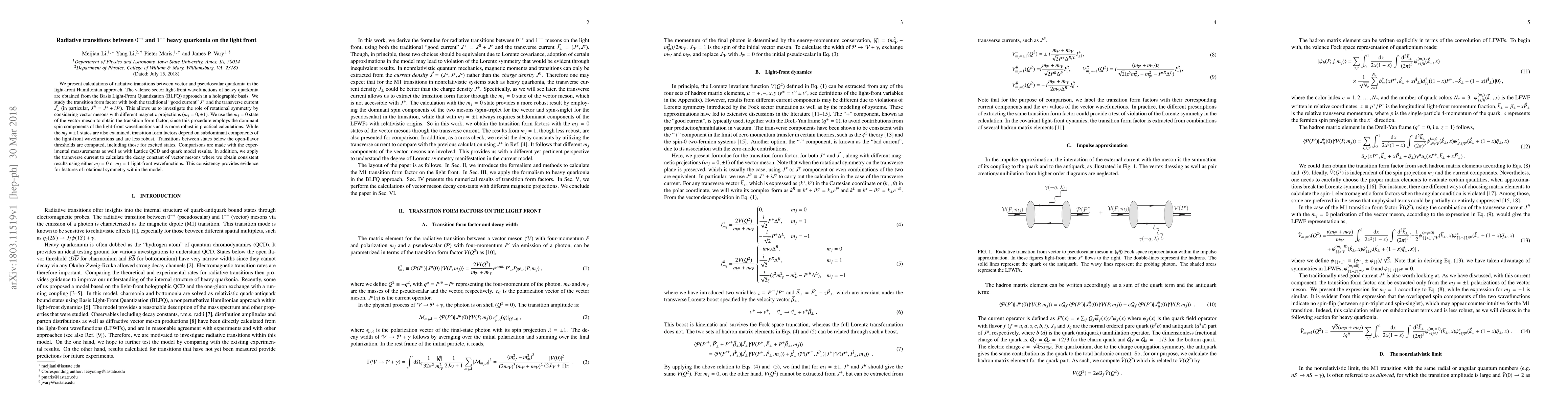 This paper calculates radiative transitions between vector and pseudoscalar heavy quarkonia using the light-front Hamiltonian approach and Basis Light-Front Quantization. It investigates the transition form factor using both longitudinal and transverse currents, finding the $m_j=0$ state to be more robust for practical calculations.