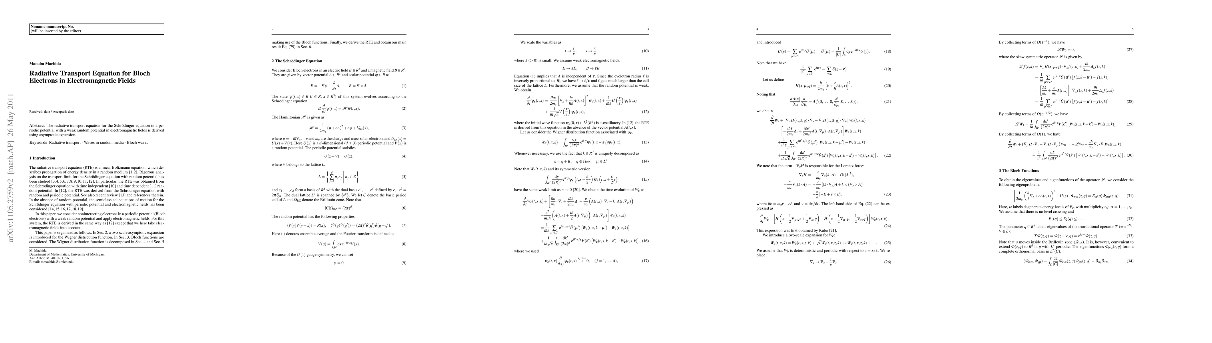 The radiative transport equation for the Schr\"odinger equation in a periodic potential with a weak random potential in electromagnetic fields is derived using asymptotic expansion.