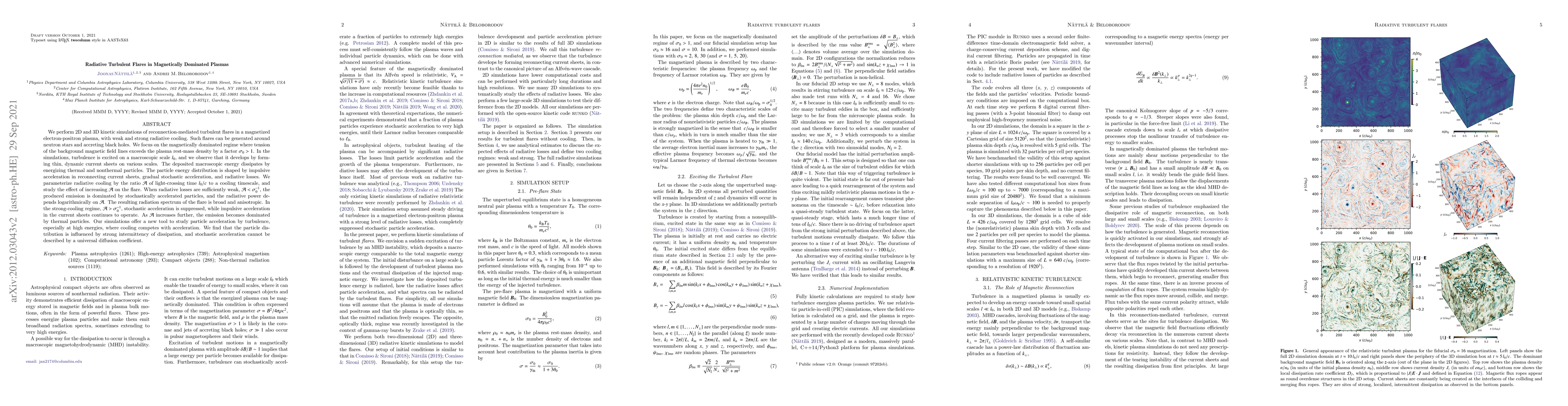 We perform 2D and 3D kinetic simulations of reconnection-mediated turbulent flares in a magnetized electron-positron plasma, with weak and strong radiative cooling. Such flares can be generated around neutron stars and accreting black holes. We focus on the magnetically-dominated regime where tension of the background magnetic field lines exceeds the plasma rest mass by a factor $\sigma_0 > 1$. In the simulations, turbulence is excited on a macroscopic scale $l_0$, and we observe that it develops by forming thin, dynamic current sheets on various scales. The deposited macroscopic energy dissipates by energizing thermal and nonthermal particles. The particle energy distribution is shaped by impulsive acceleration in reconnecting current sheets, gradual stochastic acceleration, and radiative losses. We parameterize radiative cooling by the ratio $A$ of light-crossing time $l_0/c$ to a cooling timescale, and study the effect of increasing $A$ on the flare. When radiative losses are sufficiently weak, $A<\sigma_0^{-1}$, the produced emission is dominated by stochastically accelerated particles, and the radiative power depends logarithmically on $A$. The resulting flare radiation spectrum is broad and anisotropic. In the strong-cooling regime, $A>\sigma_0^{-1}$, stochastic acceleration is suppressed while impulsive acceleration in the current sheets continues to operate. As $A$ increases further, the emission becomes dominated by thermal particles. Our simulations offer a new tool to study particle acceleration by turbulence, especially at high energies, where cooling competes with acceleration. We find that the particle distribution is influenced by strong intermittency of dissipation, and stochastic acceleration cannot be described by a universal diffusion coefficient.