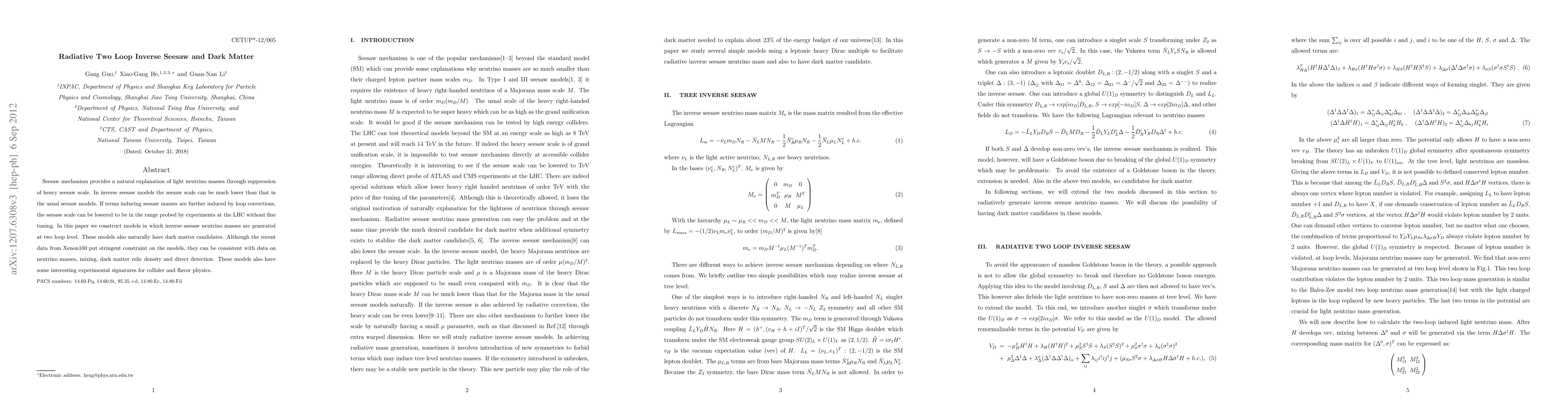 This paper constructs radiative two-loop inverse seesaw models that naturally explain light neutrino masses and provide dark matter candidates. Despite constraints from Xenon100, these models remain consistent with neutrino data, dark matter relic density, and have potential collider and flavor signatures.