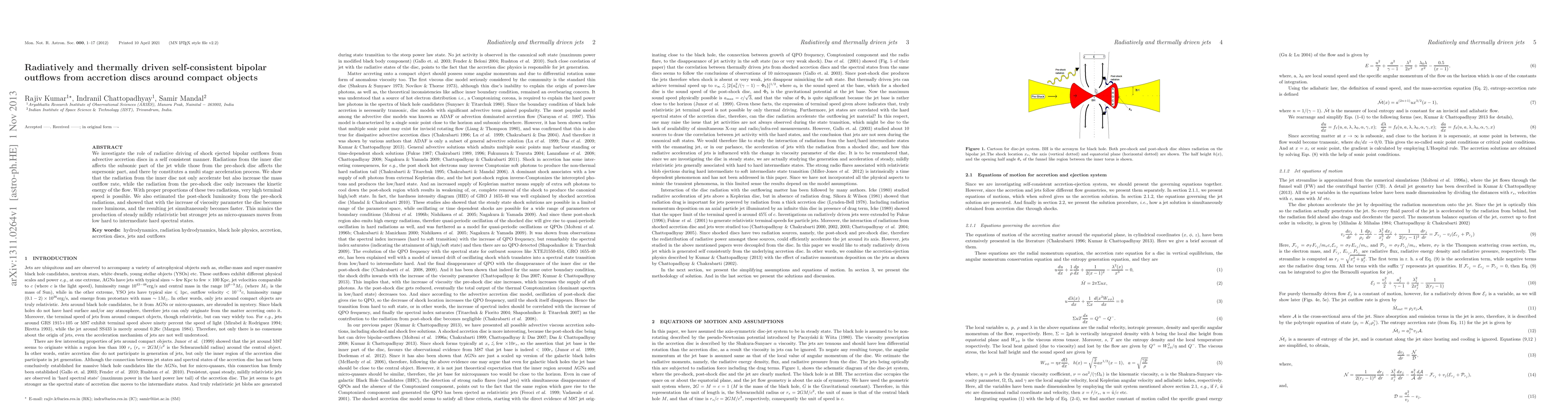 Research shows that radiative driving accelerates bipolar outflows from accretion discs, increasing mass outflow rate with inner disc radiation and kinetic energy with pre-shock disc radiation.