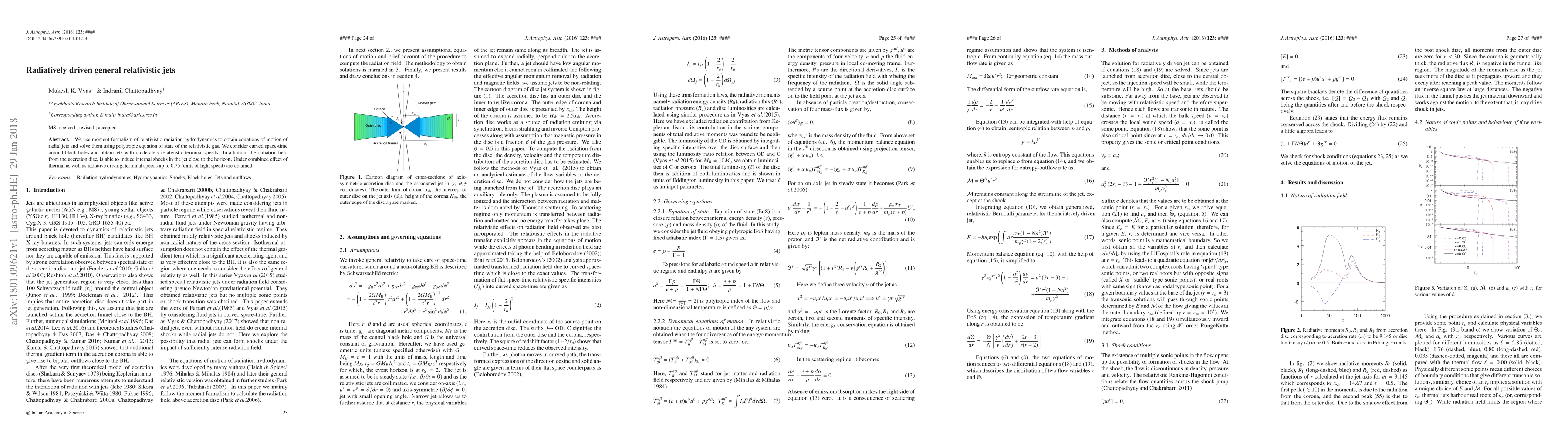 We use moment formalism of relativistic radiation hydrodynamics to obtain equations of motion of radial jets and solve them using polytropic equation of state of the relativistic gas. We consider curved space-time around black holes and obtain jets with moderately relativistic terminal speeds. In addition, the radiation field from the accretion disc, is able to induce internal shocks in the jet close to the horizon. Under combined effect of thermal as well as radiative driving, terminal speeds up to 0.75 (units of light speed) are obtained.