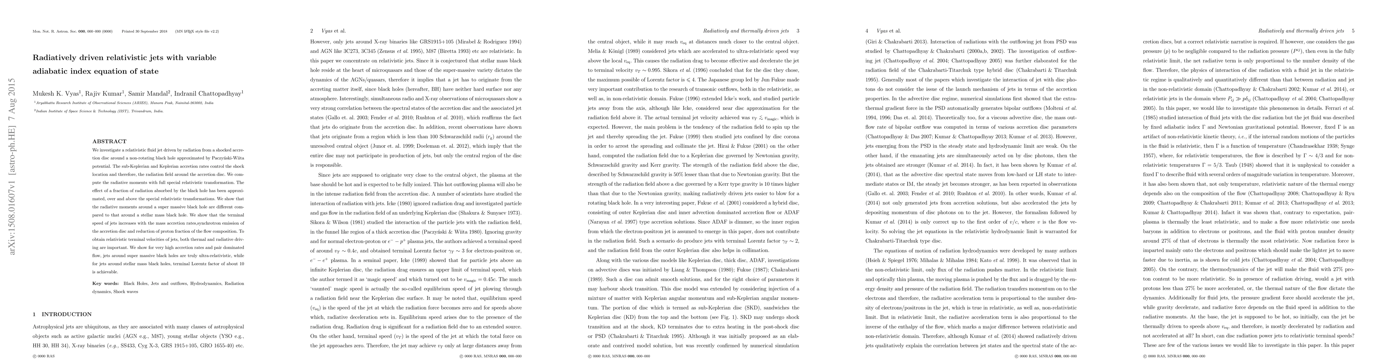 This paper examines relativistic jets driven by radiation from accretion discs around black holes, showing that radiative moments and jet terminal speeds vary with black hole mass and accretion rates. It finds that ultra-relativistic jets form around supermassive black holes, while jets around stellar mass black holes reach terminal Lorentz factors of about 10.