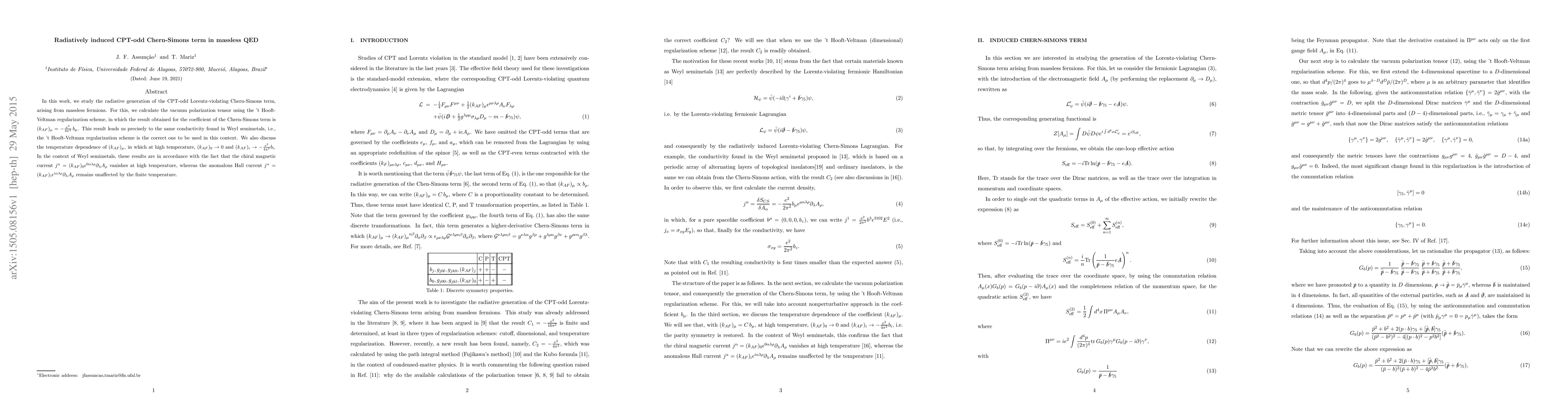 In this work, we study the radiative generation of the CPT-odd Lorentz-violating Chern-Simons term, arising from massless fermions. For this, we calculate the vacuum polarization tensor using the 't Hooft-Veltman regularization scheme, in which the result obtained for the coefficient of the Chern-Simons term is $(k_{AF})_\mu=-\frac{e^2}{4\pi^2}\,b_\mu$. This result leads us precisely to the same conductivity found in Weyl semimetals, i.e., the 't Hooft-Veltman regularization scheme is the correct one to be used in this context. We also discuss the temperature dependence of $(k_{AF})_\mu$, in which at high temperature, $(k_{AF})_0\to0$ and $(k_{AF})_i\to-\frac{e^2}{4\pi^2}b_i$. In the context of Weyl semimetals, these results are in accordance with the fact that the chiral magnetic current $j^\alpha=(k_{AF})_0\epsilon^{0\alpha\lambda\rho}\partial_\lambda A_\rho$ vanishes at high temperature, whereas the anomalous Hall current $j^\alpha=(k_{AF})_i\epsilon^{i\alpha\lambda\rho}\partial_\lambda A_\rho$ remains unaffected by the finite temperature.
