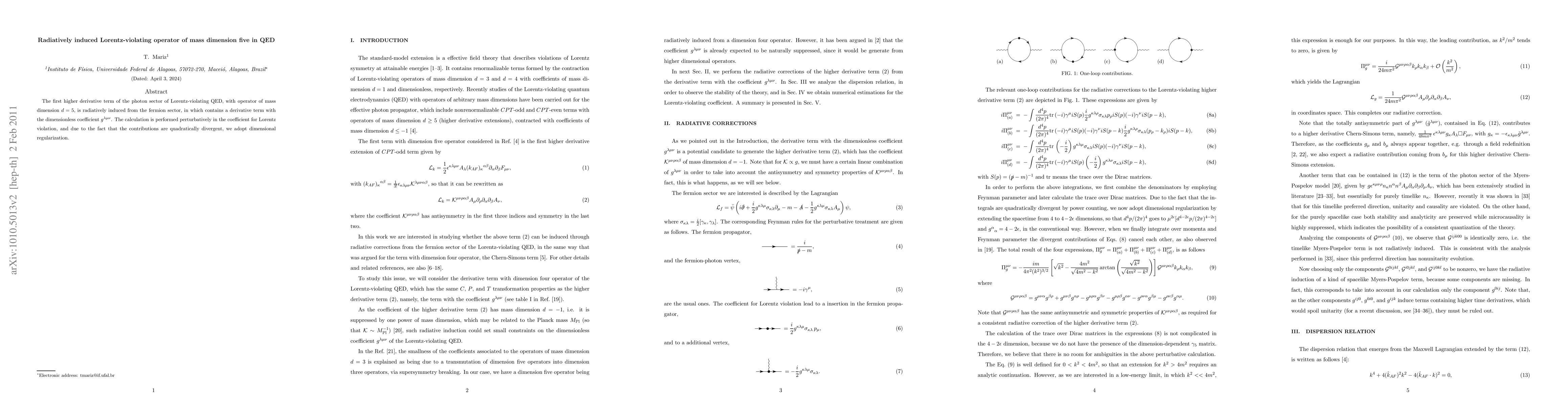 Summary: This paper investigates the radiatively induced Lorentz-violating operator of mass dimension five in QED, deriving the first higher derivative term in the photon sector from the fermion sector. The analysis employs dimensional regularization to handle quadratically divergent contributions.