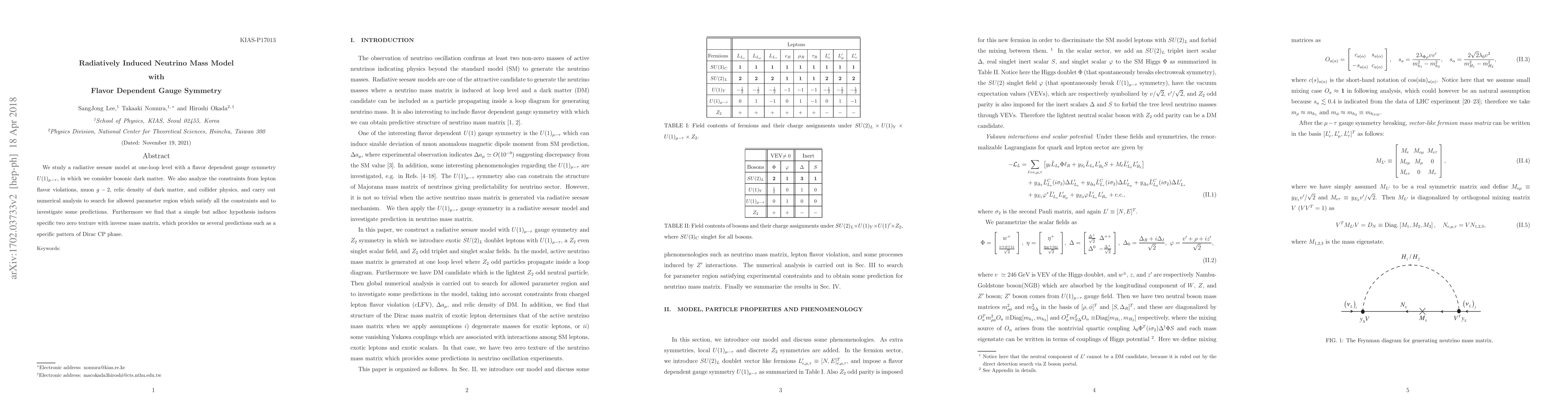 We study a radiative seesaw model at one-loop level with a flavor dependent gauge symmetry $U(1)_{\mu-\tau}$, in which we consider bosonic dark matter. We also analyze the constraints from lepton flavor violations, muon $g-2$, relic density of dark matter, and collider physics, and carry out numerical analysis to search for allowed parameter region which satisfy all the constraints and to investigate some predictions. Furthermore we find that a simple but adhoc hypothesis induces specific two zero texture with inverse mass matrix, which provides us several predictions such as a specific pattern of Dirac CP phase.