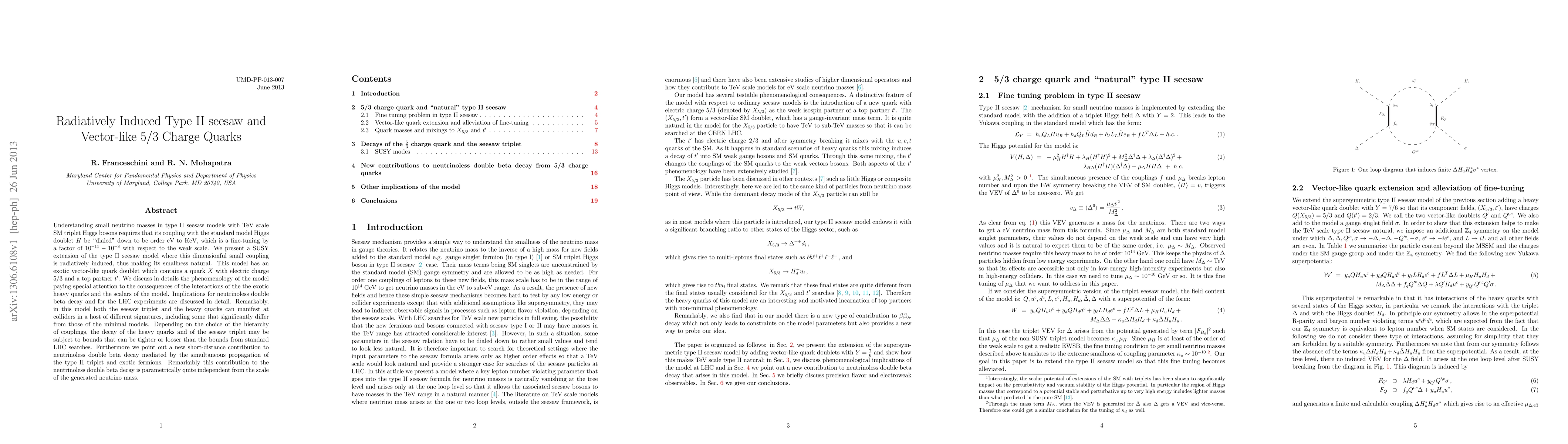 Understanding small neutrino masses in type II seesaw models with TeV scale SM triplet Higgs bosons requires that its coupling with the standard model Higgs doublet H be dialed down to be order eV to KeV, which is a fine-tuning by a factor of $10^{-11}-10^{-8}$ with respect to the weak scale. We present a SUSY extension of the type II seesaw model where this dimensionful small coupling is radiatively induced, thus making its smallness natural. This model has an exotic vector-like quark doublet which contains a quark X with electric charge 5/3 and a top partner t'. We discuss in details the phenomenology of the model paying special attention to the consequences of the interactions of the the exotic heavy quarks and the scalars of the model. Implications for neutrinoless double beta decay and for the LHC experiments are discussed in detail. Remarkably, in this model both the seesaw triplet and the heavy quarks can manifest at colliders in a host of different signatures, including some that significantly differ from those of the minimal models. Depending on the choice of the hierarchy of couplings, the decay of the heavy quarks and of the seesaw triplet may be subject to bounds that can be tighter or looser than the bounds from standard LHC searches. Furthermore we point out a new short-distance contribution to neutrinoless double beta decay mediated by the simultaneous propagation of the type II triplet and exotic fermions. Remarkably this contribution to the neutrinoless double beta decay is parametrically quite independent from the scale of the generated neutrino mass.