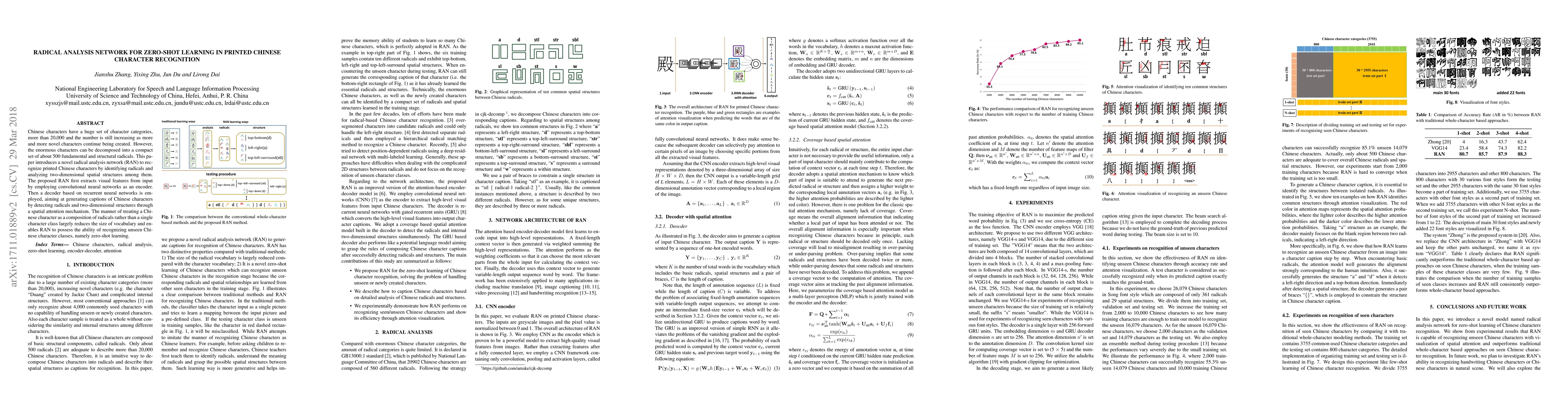 This paper proposes a Radical Analysis Network (RAN) to recognize printed Chinese characters by identifying fundamental radicals and analyzing their spatial structures. The RAN uses convolutional neural networks to extract visual features and recurrent neural networks with spatial attention to generate character captions, enabling zero-shot learning for unseen character classes.