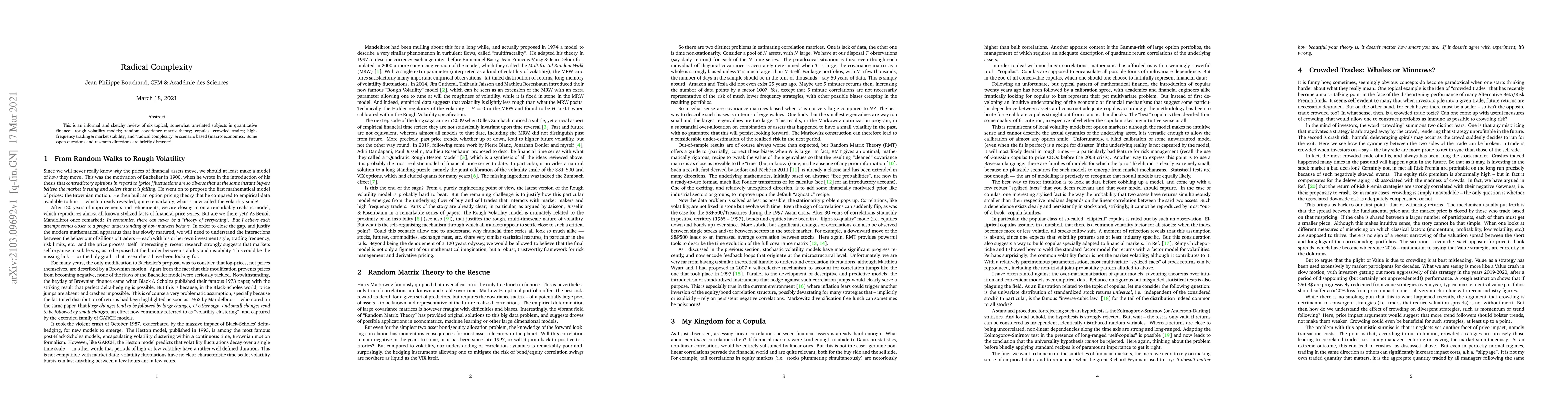 This is an informal and sketchy review of six topical, somewhat unrelated subjects in quantitative finance: rough volatility models; random covariance matrix theory; copulas; crowded trades; high-frequency trading & market stability; and "radical complexity" & scenario based (macro)economics. Some open questions and research directions are briefly discussed.