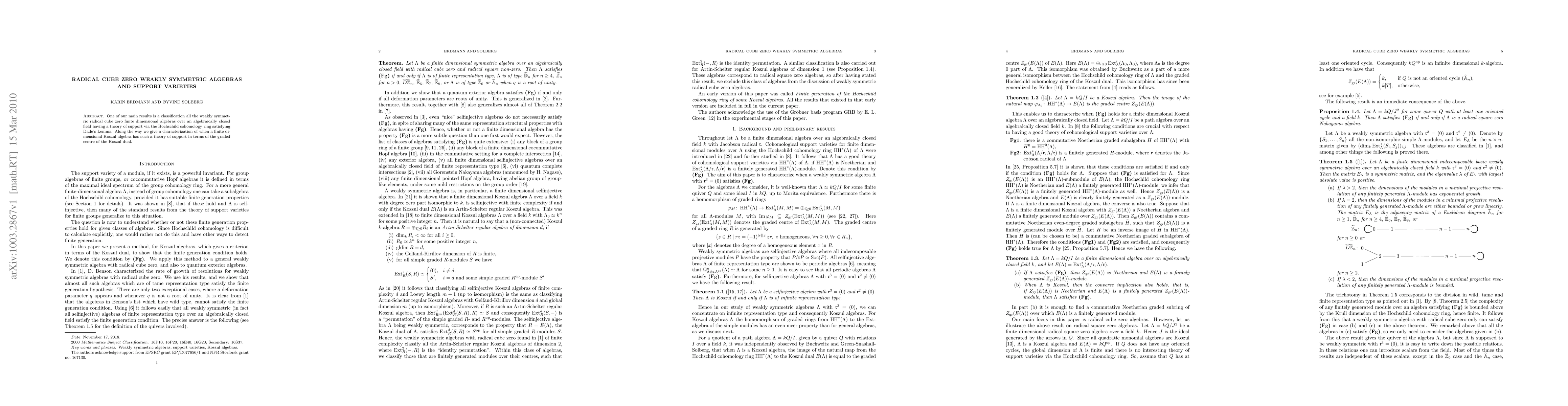 One of our main results is a classification all the weakly symmetric radical cube zero finite dimensional algebras over an algebraically closed field having a theory of support via the Hochschild cohomology ring satisfying Dade's Lemma. Along the way we give a characterization of when a finite dimensional Koszul algebra has such a theory of support in terms of the graded centre of the Koszul dual.