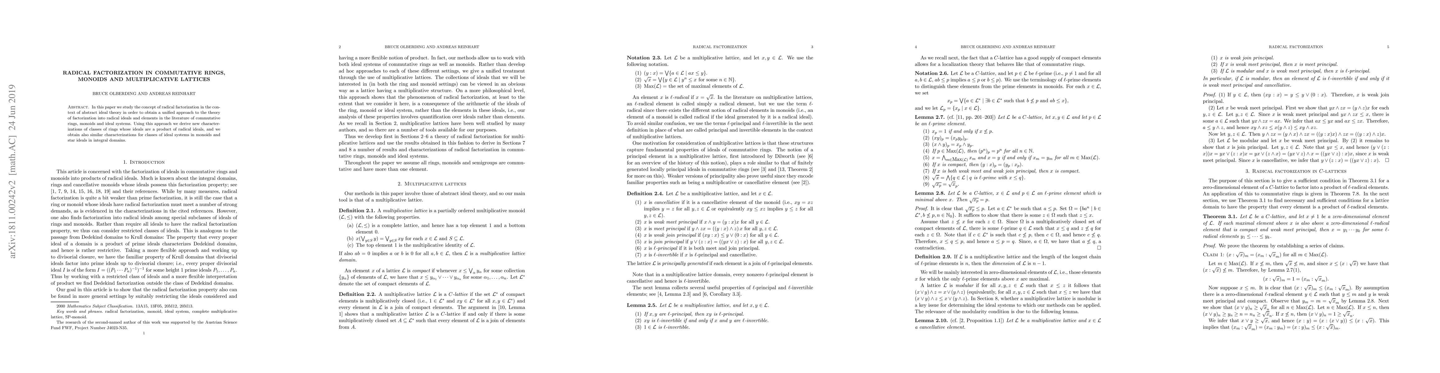 This paper explores radical factorization in commutative rings, monoids, and multiplicative lattices to unify the theory of factorization into radical ideals and elements. It provides new characterizations for rings, monoids, and integral domains where ideals are products of radical ideals.