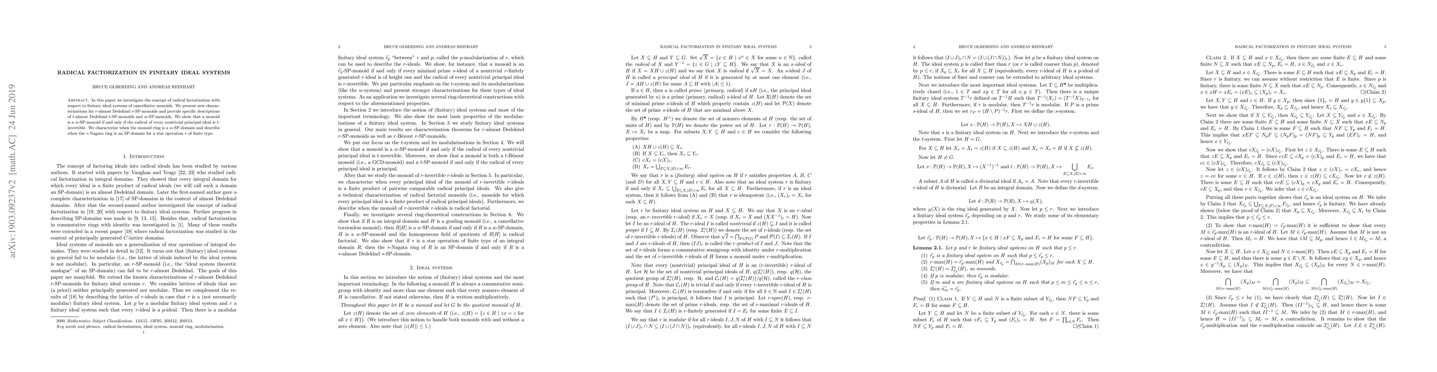 This paper explores radical factorization in finitary ideal systems of cancellative monoids, presenting new characterizations for r-almost Dedekind r-SP-monoids and specific descriptions for t-almost Dedekind t-SP-monoids and w-SP-monoids, concluding that a monoid is a w-SP-monoid if every nontrivial principal ideal's radical is t-invertible.