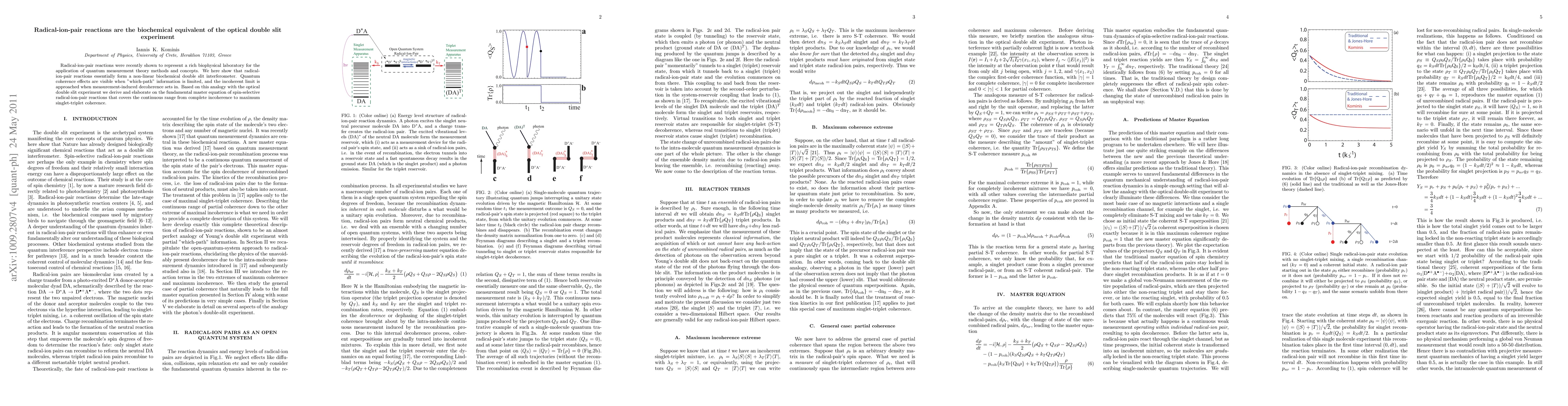 This paper explores radical-ion-pair reactions as a biochemical analog of the optical double slit experiment, demonstrating quantum coherence effects in these reactions when "which-path" information is limited, transitioning to incoherent behavior under decoherence. The study derives a fundamental master equation for spin-selective radical-ion-pair reactions.