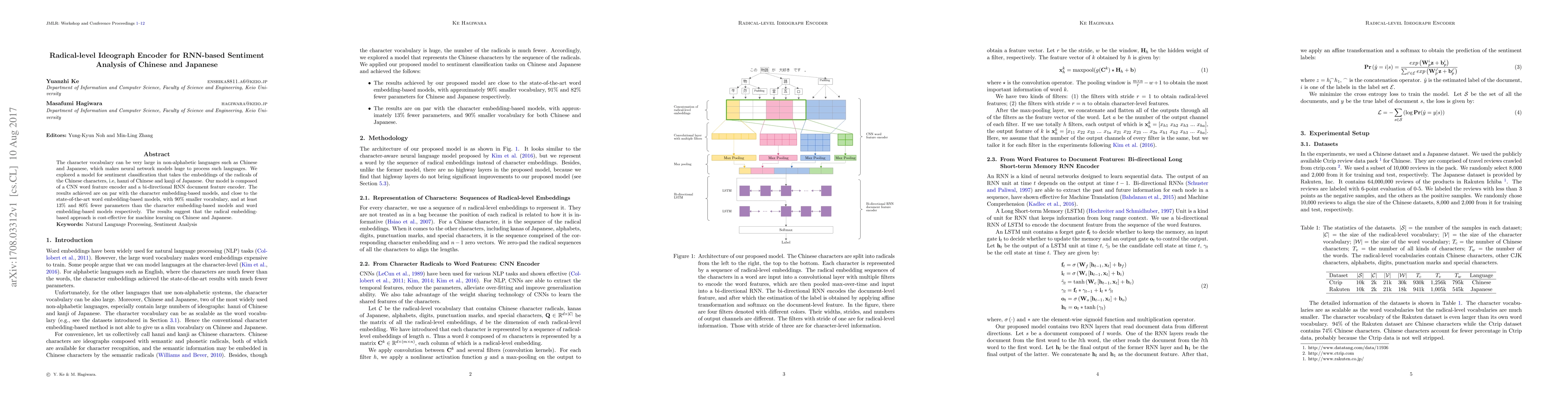 This paper proposes a radical-level ideograph encoder for RNN-based sentiment analysis in Chinese and Japanese, achieving competitive results with significantly smaller vocabulary and fewer parameters compared to traditional character and word embedding models.