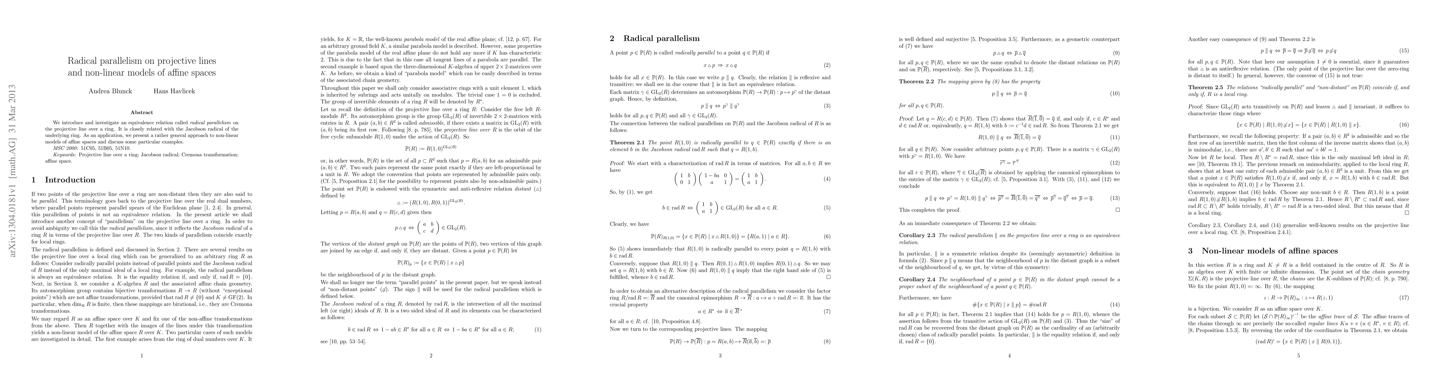 We introduce and investigate an equivalence relation called "radical parallelism" on the projective line over a ring. It is closely related with the Jacobson radical of the underlying ring. As an application, we present a rather general approach to non-linear models of affine spaces and discuss some particular examples.