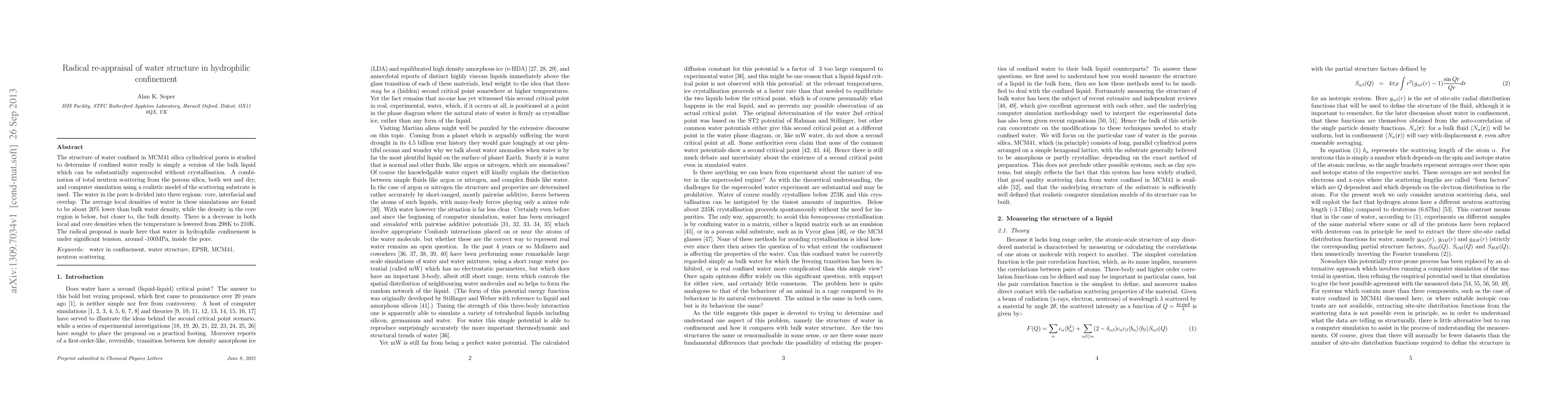 This study investigates the structure of water confined in MCM41 silica pores, revealing that local densities are about 20% lower than bulk water, with significant tension of around -100MPa in the core region. The findings suggest that confined water differs substantially from bulk water, challenging the notion that it can be supercooled without crystallization.