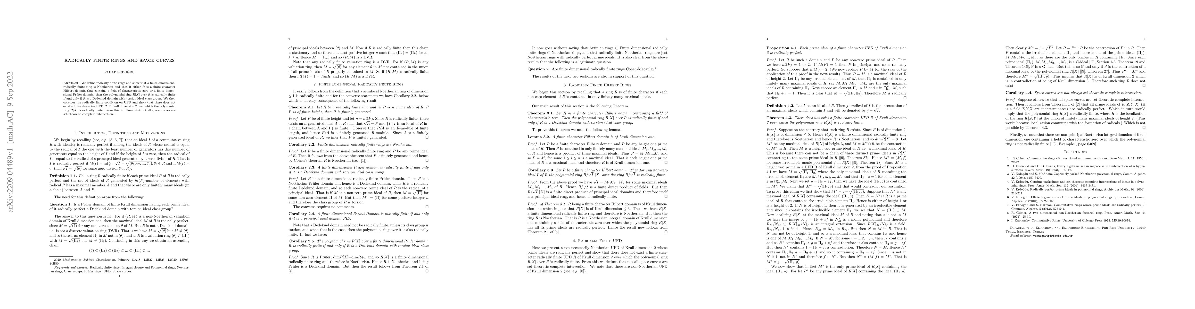 We define radically finite rings and show that finite dimensional radically finite rings are Noetherian, and that if either R is a finite character Hilbert domain that contains a field of characteristic zero or a finite dimensional Prufer domain, then the polynomial ring R[X] over R is radically finite if and only if R is a Dedekind domain with torsion ideal class group. We then consider the radically finite condition on UFD and show that there does not exist a finite character UFD R of Krull dimension 2 over which the polynomial ring R[X] is radically finite. From this it follows that not all space curves are set theoretic complete intersection.