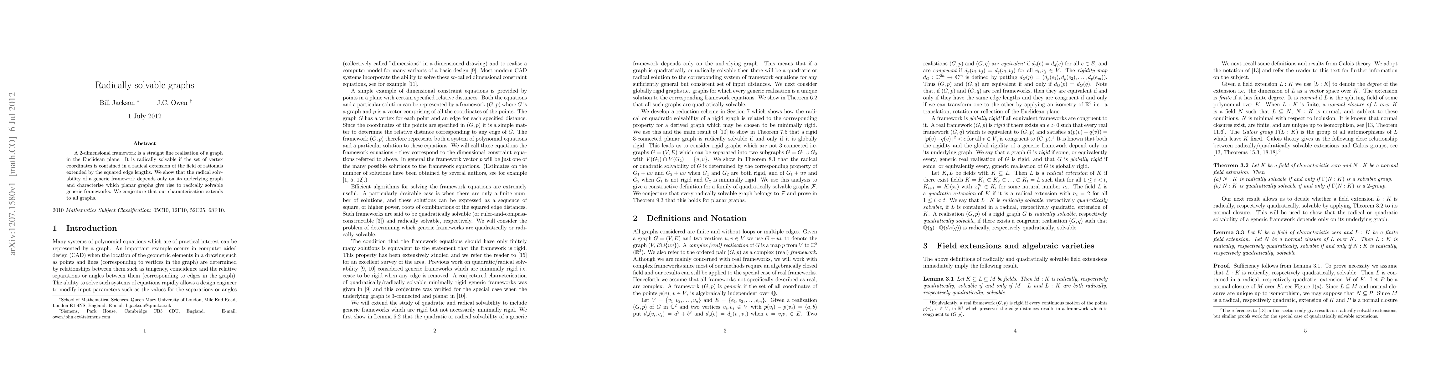 A 2-dimensional framework is a straight line realisation of a graph in the Euclidean plane. It is radically solvable if the set of vertex coordinates is contained in a radical extension of the field of rationals extended by the squared edge lengths. We show that the radical solvability of a generic framework depends only on its underlying graph and characterise which planar graphs give rise to radically solvable generic frameworks. We conjecture that our characterisation extends to all graphs.