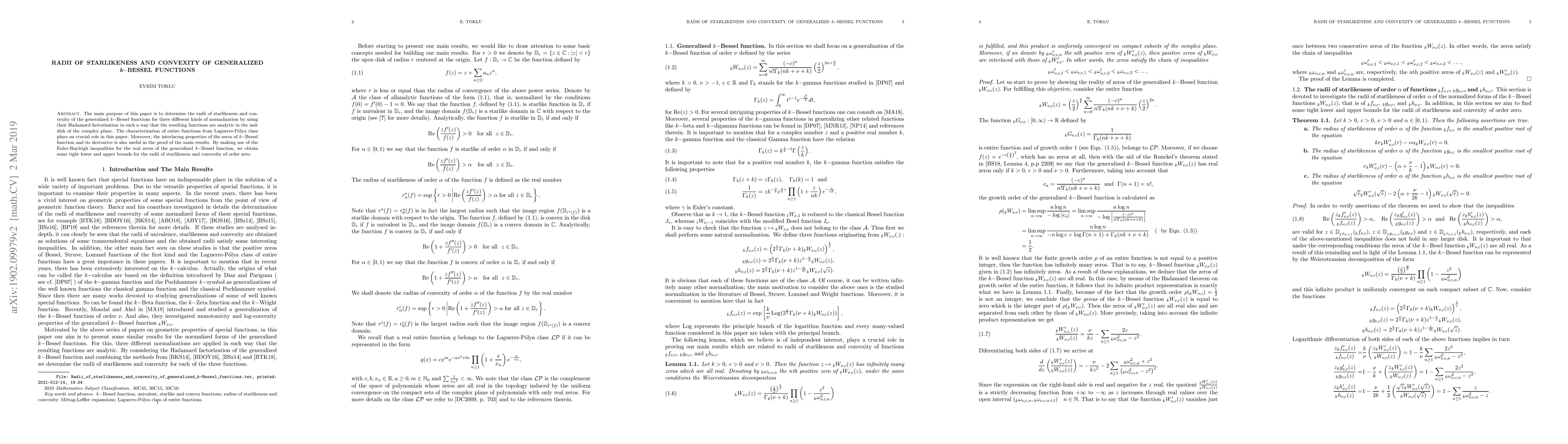 The main purpose of this paper is to determine the radii of starlikeness and convexity of the generalized $\emph{k}-$Bessel functions for three different kinds of normalization by using their Hadamard factorization in such a way that the resulting functions are analytic in the unit disk of the complex plane. The characterization of entire functions from Laguerre-P\'olya class plays an crucial role in this paper. Moreover, the interlacing properties of the zeros of $\emph{k}-$Bessel function and its derivative is also useful in the proof of the main results. By making use of the Euler-Rayleigh inequalities for the real zeros of the generalized $\emph{k}-$Bessel function, we obtain some tight lower and upper bounds for the radii of starlikeness and convexity of order zero.