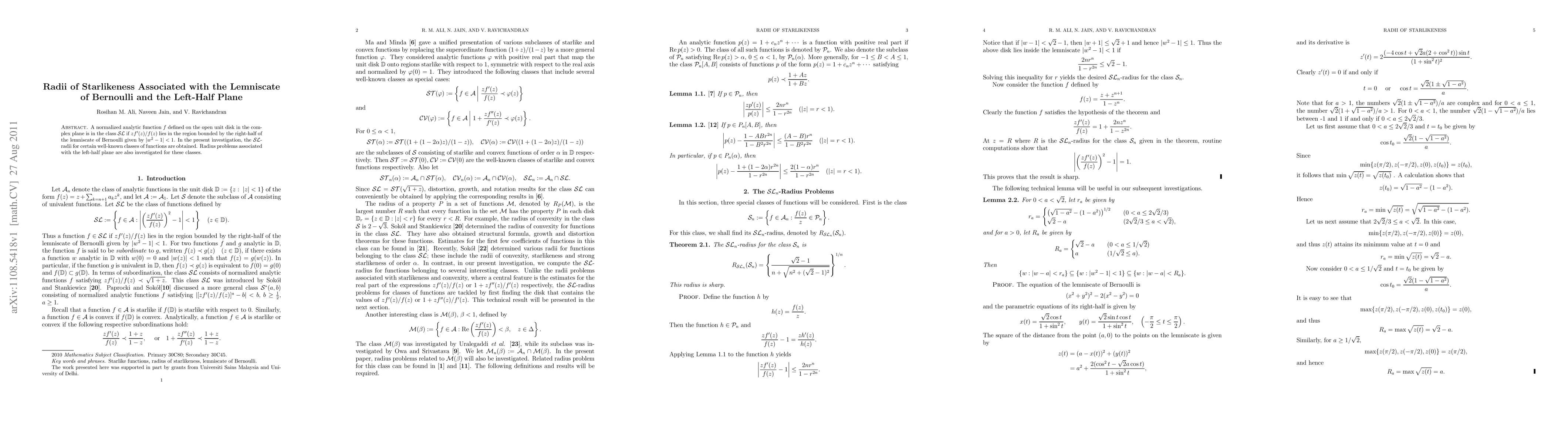 This study investigates the radii of starlikeness for various classes of functions, focusing on their association with the lemniscate of Bernoulli and the left-half plane, providing key findings on function behavior in specific regions of the complex plane.