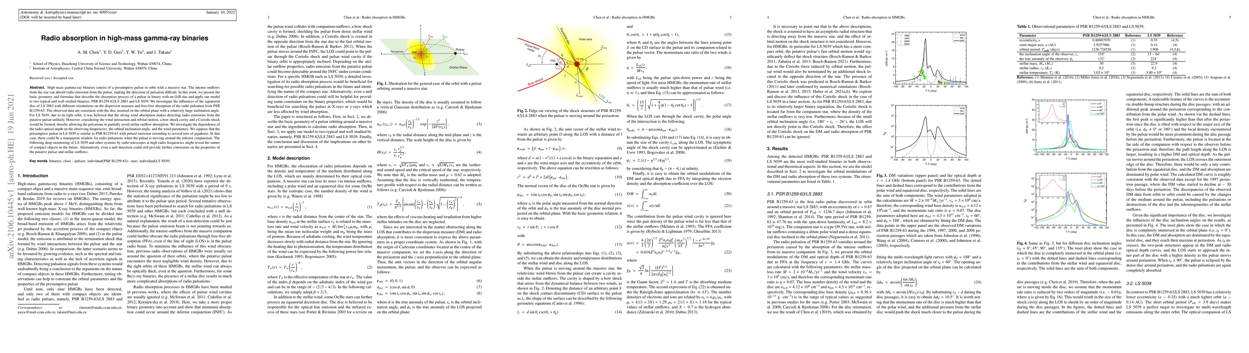 High-mass gamma-ray binaries consist of a presumptive pulsar in orbit with a massive star. The intense outflows from the star can absorb radio emission from the pulsar, making the detection of pulsation difficult. In this work, we present the basic geometry and formulae that describe the absorption process of a pulsar in binary with an O/B star and apply our model to two typical and well-studied binaries: PSR~B1259-63/LS~2883 and LS 5039. We investigate the influences of the equatorial disc of LS 2883 with different orientations on the dispersion measure and free-free absorption of the radio pulsation from PSR B1259-63. The observed data are consistent with the disc inserted on the orbital plane with a relatively large inclination angle. For LS 5039, due to its tight orbit, it was believed that the strong wind absorption makes detecting radio emissions from the putative pulsar unlikely. However, considering the wind interaction and orbital motion, a bow shock cavity and a Coriolis shock would be formed, thereby allowing the pulsations to partially avoid stellar outflow absorption. We investigate the dependence of the radio optical depth on the observing frequencies, the orbital inclination angle, and the wind parameters. We suppose that the presumptive pulsar in LS 5039 is similar to PSR B1259-63 with pulsed emission extending to several tens of gigahertz. In that case, there could be a transparent window for radio pulsations when the pulsar is moving around the inferior conjunction. The following deep monitoring of LS 5039 and other systems by radio telescopes at high radio frequencies might reveal the nature of compact objects in the future. Alternatively, even a null detection could still provide further constraints on the properties of the putative pulsar and stellar outflows.