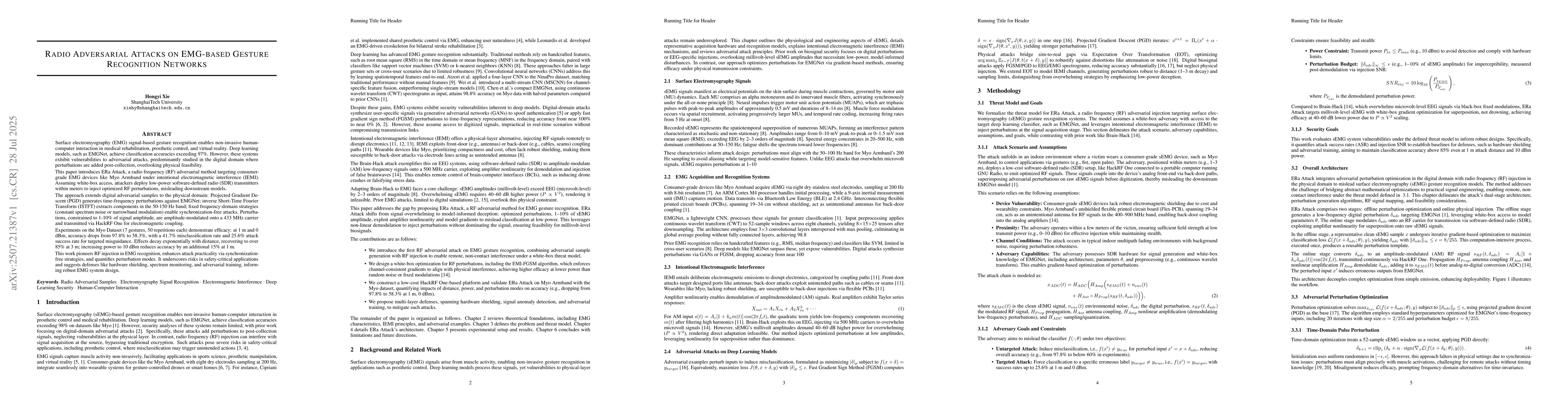 This research introduces ERa Attack, the first radio frequency method that intentionally interferes with EMG devices used in gesture recognition, causing significant accuracy drops from 97.8% to 58.3%. The attack uses low-power radio transmitters to inject optimized electromagnetic signals, which are amplitude-modulated onto 433 MHz carriers. The effectiveness decreases with distance, and the study proposes defenses like hardware shielding and adversarial training to build more robust EMG systems.
