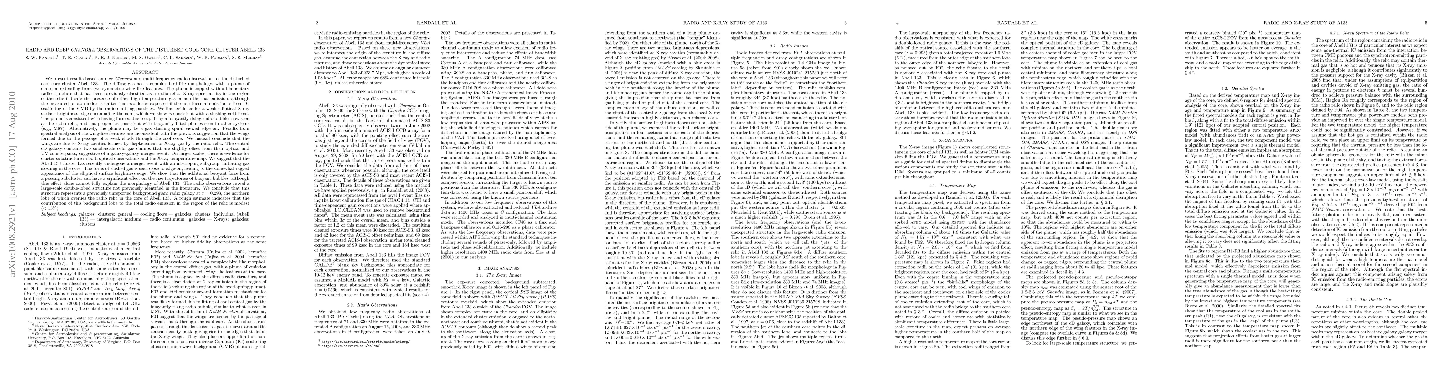 This paper reports new Chandra and multi-frequency radio observations of the Abell 133 cluster, revealing a complex bird-like morphology and a filamentary radio relic. The study suggests that the X-ray wings are due to gas displacement by the radio relic, rather than a shock, and identifies evidence for a recent merger event with an interloping subgroup.
