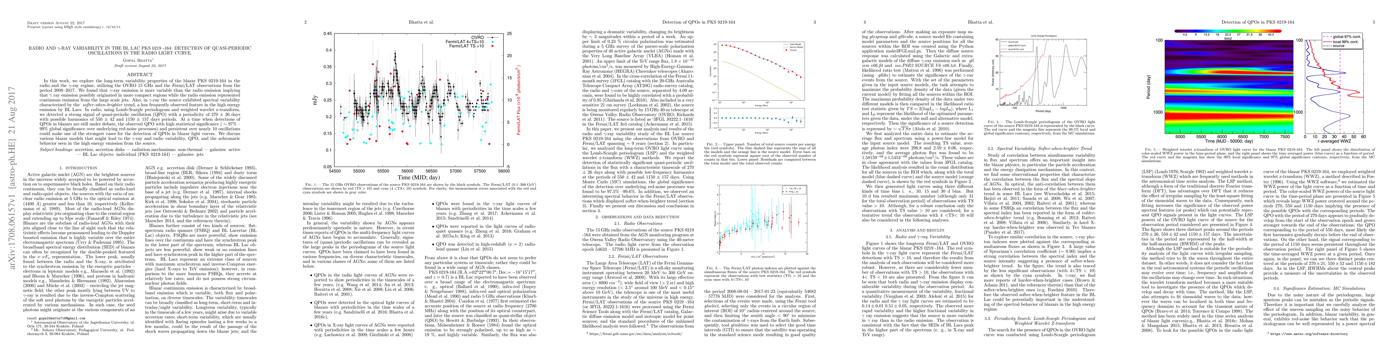 Researchers detected quasi-periodic oscillations in the radio light curve of blazar PKS 0219-164, showing high statistical significance and persistence over nearly 10 oscillations. Gamma-ray emission is more variable than radio emission, suggesting compact region origins.