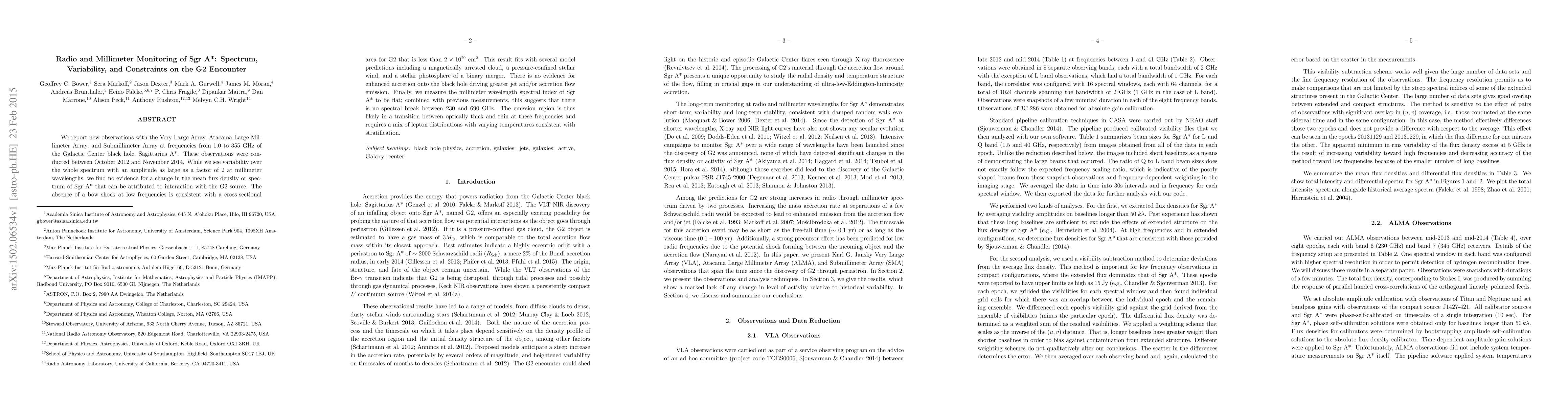 This study reports new radio and millimeter observations of Sagittarius A* (Sgr A*) from 1.0 to 355 GHz, revealing significant variability but no evidence of changes due to the G2 encounter. The findings suggest G2's cross-sectional area is less than $2 \times 10^{29}$ cm$^2$, and the millimeter spectral index is flat, indicating a transition between optically thick and thin emission regions.