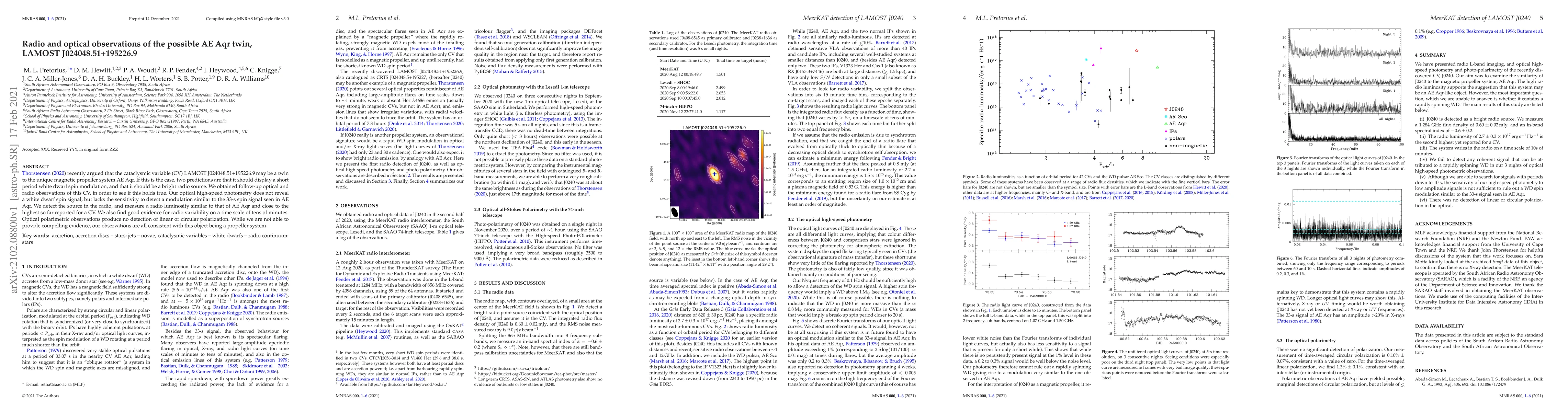 Thorstensen (2020) recently argued that the cataclysmic variable (CV) LAMOST J024048.51+195226.9 may be a twin to the unique magnetic propeller system AE Aqr. If this is the case, two predictions are that it should display a short period white dwarf spin modulation, and that it should be a bright radio source. We obtained follow-up optical and radio observations of this CV, in order to see if this holds true. Our optical high-speed photometry does not reveal a white dwarf spin signal, but lacks the sensitivity to detect a modulation similar to the 33-s spin signal seen in AE Aqr. We detect the source in the radio, and measure a radio luminosity similar to that of AE Aqr and close to the highest so far reported for a CV. We also find good evidence for radio variability on a time scale of tens of minutes. Optical polarimetric observations produce no detection of linear or circular polarization. While we are not able to provide compelling evidence, our observations are all consistent with this object being a propeller system.