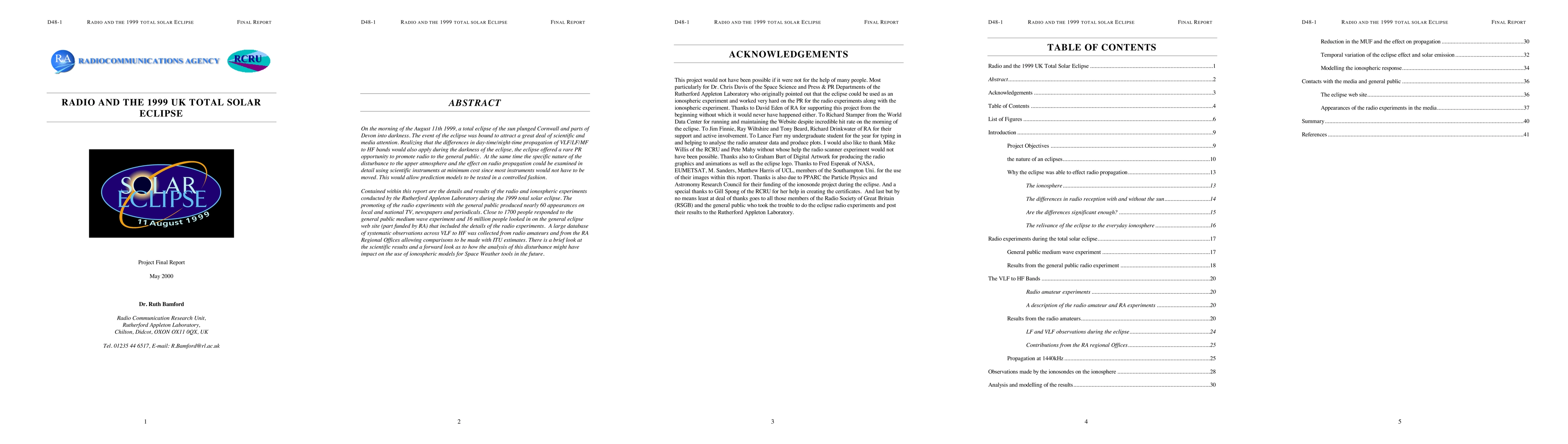 On the morning of the August 11th 1999, a total eclipse of the sun plunged Cornwall and parts of Devon into darkness. The event of the eclipse was bound to attract a great deal of scientific and media attention. Realizing that the differences in day-time/night-time propagation of VLF/LF/MF to HF bands would also apply during the darkness of the eclipse, the eclipse offered a rare PR opportunity to promote radio to the general public. At the same time the specific nature of the disturbance to the upper atmosphere and the effect on radio propagation could be examined in detail using scientific instruments at minimum cost since most instruments would not have to be moved. This would allow prediction models to be tested in a controlled fashion. Contained within this report are the details and results of the radio and ionospheric experiments conducted by the Rutherford Appleton Laboratory during the 1999 total solar eclipse. The promoting of the radio experiments with the general public produced nearly 60 appearances on local and national TV, newspapers and periodicals. Close to 1700 people responded to the general public medium wave experiment and 16 million people looked in on the general eclipse web site (part funded by RA) that included the details of the radio experiments. A large database of systematic observations across VLF to HF was collected from radio amateurs and from the RA Regional Offices allowing comparisons to be made with ITU estimates. There is a brief look at the scientific results and a forward look as to how the analysis of this disturbance might have impact on the use of ionospheric models for Space Weather tools in the future.