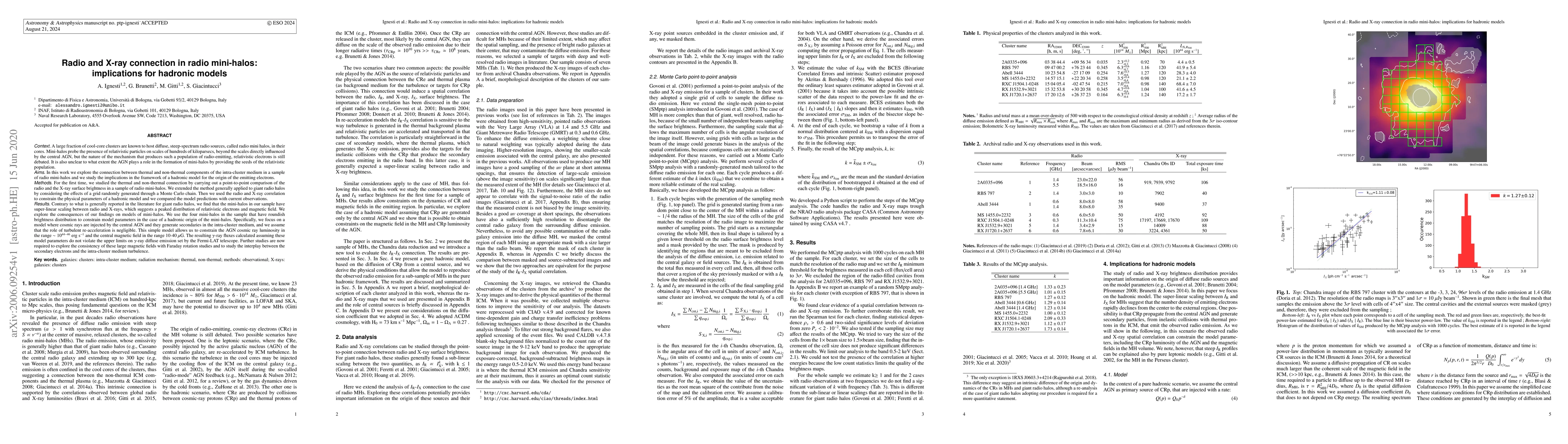 This paper investigates the relationship between radio mini-halos and X-ray emissions in relaxed clusters, finding a super-linear scaling that suggests a peaked distribution of relativistic electrons and magnetic fields. The study constrains a hadronic model where AGN-generated cosmic rays produce secondary particles in the intracluster medium, yielding AGN luminosity and magnetic field ranges consistent with current observations.