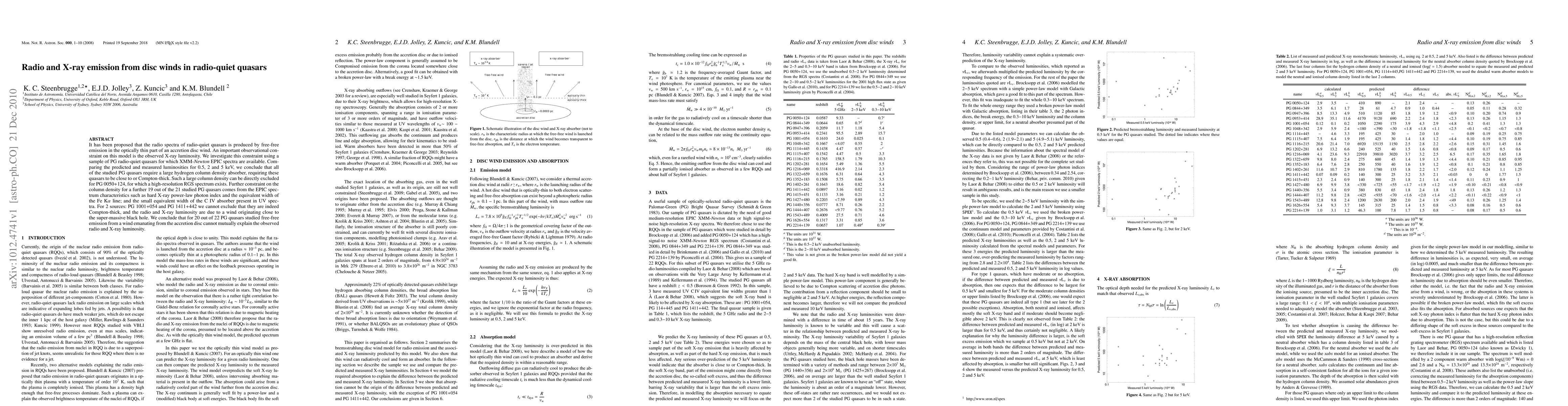 This study investigates the radio and X-ray emission from disc winds in radio-quiet quasars, finding that most PG quasars require a large hydrogen column density absorber, suggesting they are Compton-thick. Only two quasars, PG 1001+054 and PG 1411+442, may have a wind-originating radio and X-ray luminosity close to the black hole.
