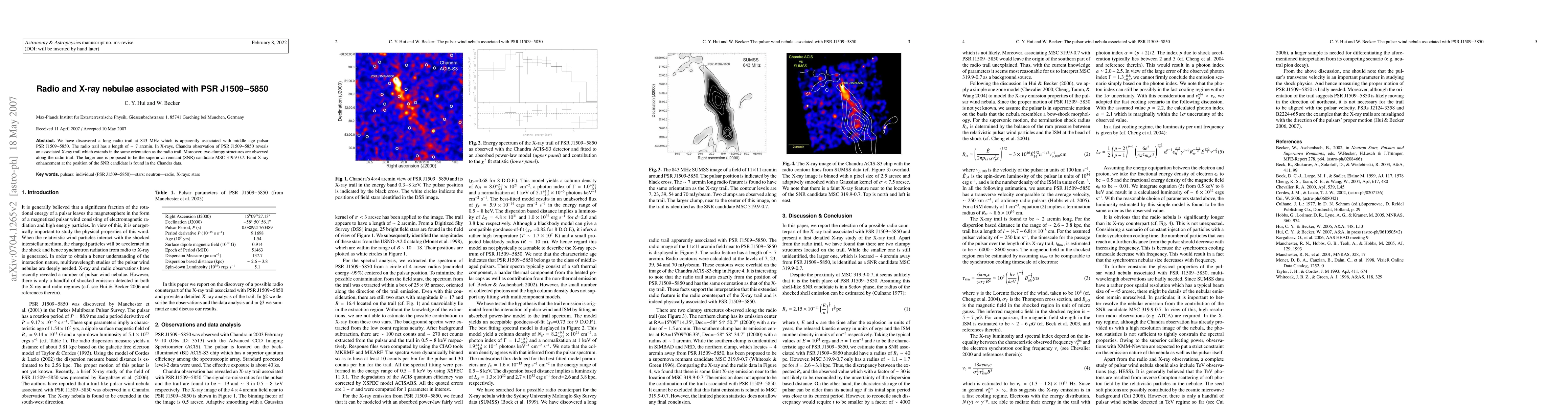 We have discovered a long radio trail at 843 MHz which is apparently associated with middle age pulsar PSR J1509-5850. The radio trail has a length of ~7 arcmin. In X-rays, Chandra observations of PSR J1509-5850 reveal an associated X-ray trail which extends in the same orientation as the radio trail. Moreover, two clumpy structures are observed along the radio trail. The larger one is proposed to be the supernova remnant (SNR) candidate MSC 319.9-0.7. Faint X-ray enhancement at the position of the SNR candidate is found in the Chandra data.
