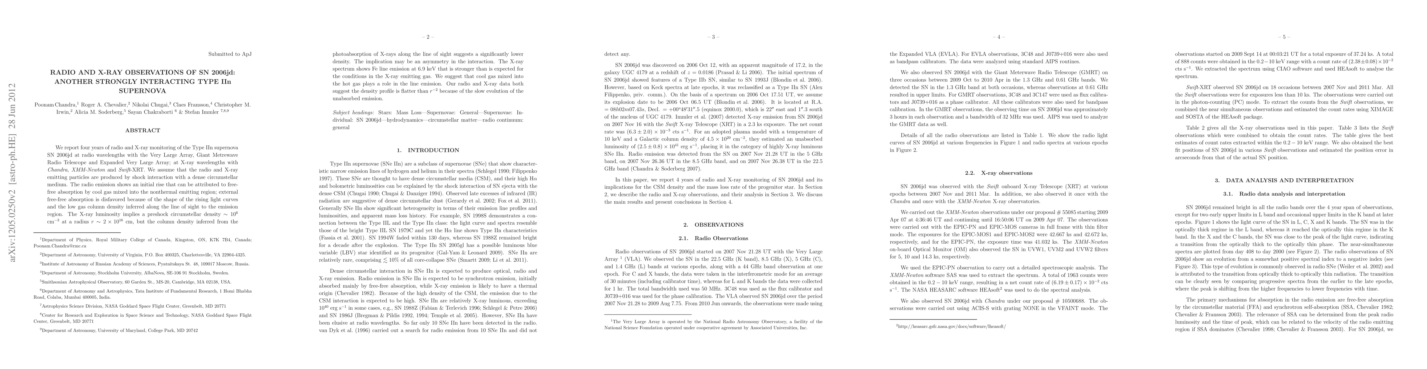 We report four years of radio and X-ray monitoring of the Type IIn supernova SN 2006jd at radio wavelengths with the Very Large Array, Giant Metrewave Radio Telescope and Expanded Very Large Array; at X-ray wavelengths with {\em Chandra}, {\em XMM-Newton} and {\em Swift}-XRT. We assume that the radio and X-ray emitting particles are produced by shock interaction with a dense circumstellar medium. The radio emission shows an initial rise that can be attributed to free-free absorption by cool gas mixed into the nonthermal emitting region; external free-free absorption is disfavored because of the shape of the rising light curves and the low gas column density inferred along the line of sight to the emission region. The X-ray luminosity implies a preshock circumstellar density $\sim 10^6$ cm$^{-3}$ at a radius $r\sim 2\times 10^{16}$ cm, but the column density inferred from the photoabsorption of X-rays along the line of sight suggests a significantly lower density. The implication may be an asymmetry in the interaction. The X-ray spectrum shows Fe line emission at 6.9 keV that is stronger than is expected for the conditions in the X-ray emitting gas. We suggest that cool gas mixed into the hot gas plays a role in the line emission. Our radio and X-ray data both suggest the density profile is flatter than $r^{-2}$ because of the slow evolution of the unabsorbed emission.