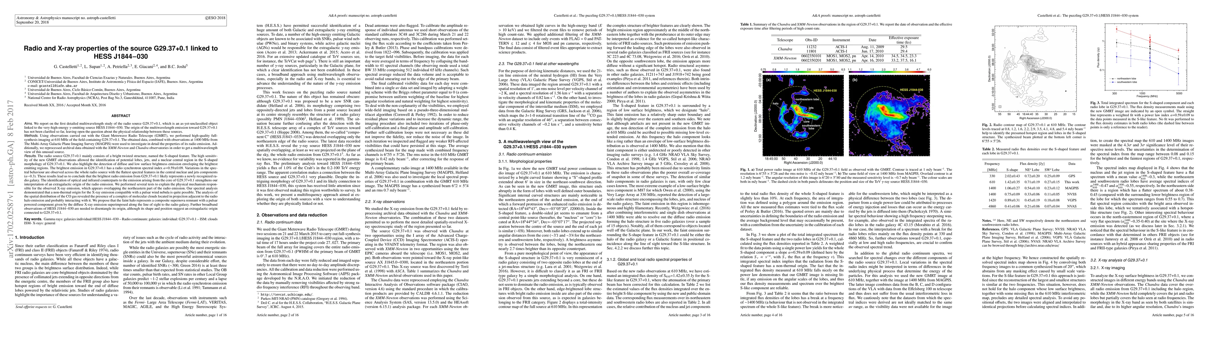 Using observations carried out with the GMRT, we performed high-quality full-synthesis imaging at 610 MHz of the source G29.37+0.1, which is an as-yet-unclassified object linked to the TeV source HESS J1844-030. These data, combined with observations at 1400 MHz from MAGPIS were used to investigate the properties of its radio emission. Additionally, we reprocessed XMM-Newton and Chandra archival data. G29.37+0.1 mainly consists of a bright twisted structure, named the S-shaped feature. The high sensitivity of the new GMRT observations allowed the identification of potential lobes, jets, and a nuclear central region in the S-shaped morphology of G29.37+0.1. We also highlight the detection of diffuse and low surface brightness emission enveloping the brightest emitting regions. The brightest emission in G29.37+0.1 has a radio synchrotron spectral index 0.59+/-0.09. Variations in the spectral behavior are observed across the whole radio source with the flattest spectral features in the central nuclear and jets components (alpha~0.3). These results lead us to conclude that the brightest radio emission from G29.37+0.1 likely represents a newly recognized radio galaxy. The identification of optical and infrared counterparts to the emission from the core of G29.37+0.1 strengthens our interpretation of an extragalactic origin of the radio emission. Our spectral analysis demonstrated that a non-thermal origin for the X-ray emission compatible with a pulsar wind nebula is quite possible. The analysis of the spatial distribution of the CO gas revealed the presence of a complex of molecular clouds located in projection adjacent to the radio halo emission and probably interacting with it. We propose that the faint halo represents a composite supernova remnant with a pulsar powered component given by the diffuse X-ray emission superimposed along the line of sight to the radio galaxy.