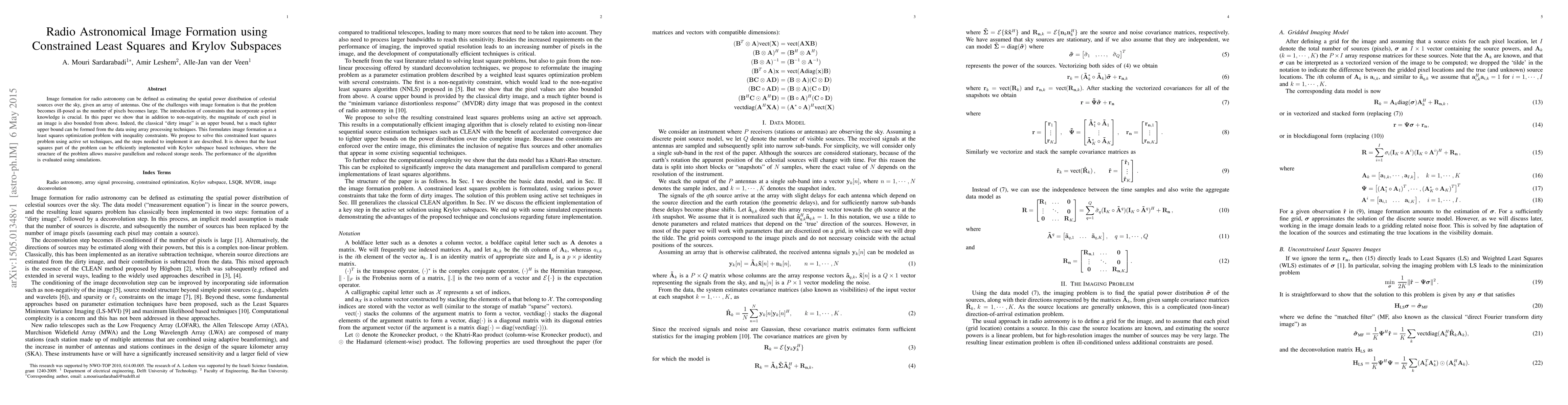 This paper proposes a constrained least squares method for radio astronomical image formation, incorporating upper bounds on pixel values derived from array processing. It utilizes active set techniques and Krylov subspace methods for efficient computation, demonstrating significant performance improvements through simulations.