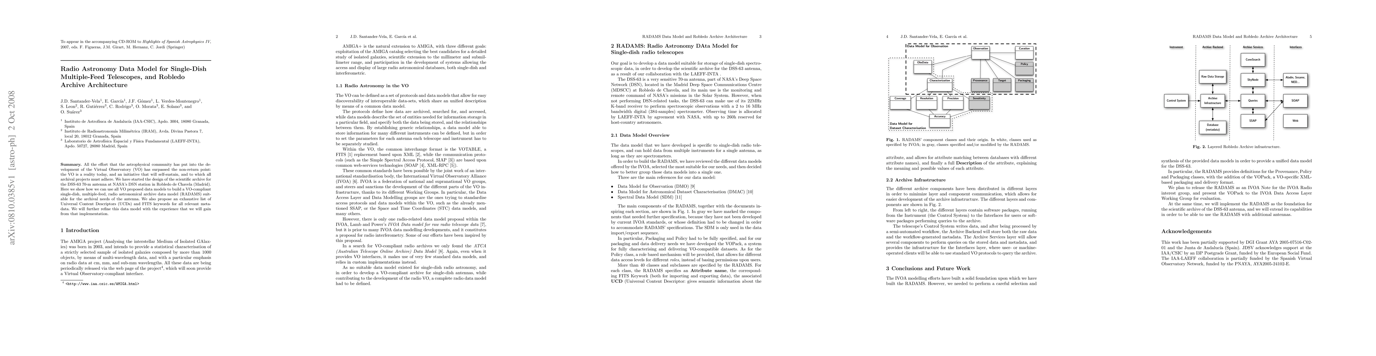 All the effort that the astrophysical community has put into the development of the Virtual Observatory (VO) has surpassed the non-return point: the VO is a reality today, and an initiative that will self-sustain, and to which all archival projects must adhere. We have started the design of the scientific archive for the DSS-63 70-m antenna at NASA's DSN station in Robledo de Chavela (Madrid). Here we show how we can use all VO proposed data models to build a VO-compliant single-dish, multiple-feed, radio astronomical archive data model (RADAMS) suitable for the archival needs of the antenna. We also propose an exhaustive list of Universal Content Descriptors (UCDs) and FITS keywords for all relevant metadata. We will further refine this data model with the experience that we will gain from that implementation.