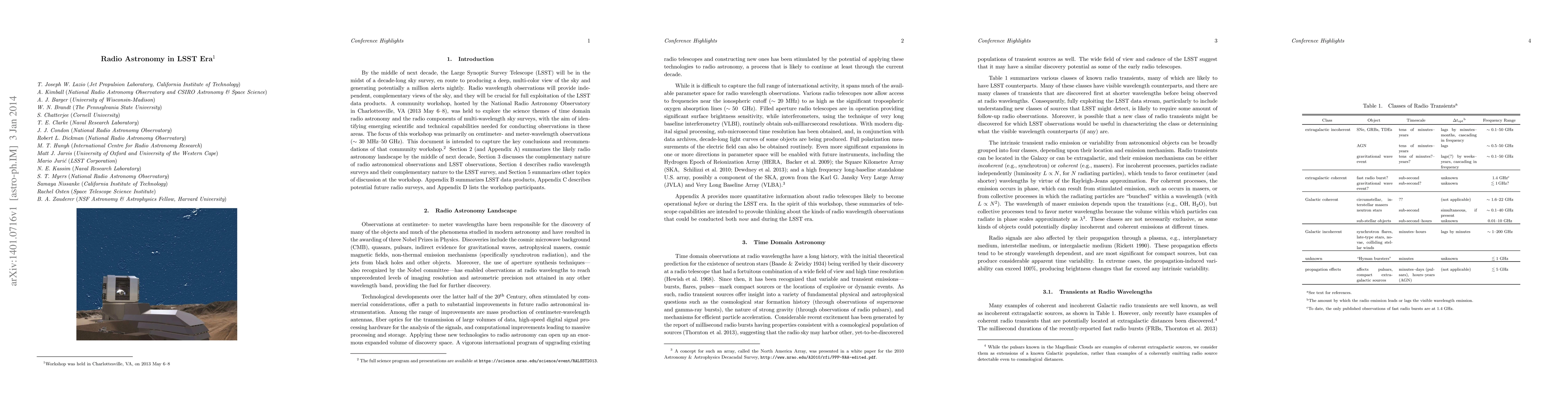 A community meeting on the topic of "Radio Astronomy in the LSST Era" was hosted by the National Radio Astronomy Observatory in Charlottesville, VA (2013 May 6--8). The focus of the workshop was on time domain radio astronomy and sky surveys. For the time domain, the extent to which radio and visible wavelength observations are required to understand several classes of transients was stressed, but there are also classes of radio transients for which no visible wavelength counterpart is yet known, providing an opportunity for discovery. From the LSST perspective, the LSST is expected to generate as many as 1 million alerts nightly, which will require even more selective specification and identification of the classes and characteristics of transients that can warrant follow up, at radio or any wavelength. The LSST will also conduct a deep survey of the sky, producing a catalog expected to contain over 38 billion objects in it. Deep radio wavelength sky surveys will also be conducted on a comparable time scale, and radio and visible wavelength observations are part of the multi-wavelength approach needed to classify and understand these objects. Radio wavelengths are valuable because they are unaffected by dust obscuration and, for galaxies, contain contributions both from star formation and from active galactic nuclei. The workshop touched on several other topics, on which there was consensus including the placement of other LSST "Deep Drilling Fields," inter-operability of software tools, and the challenge of filtering and exploiting the LSST data stream. There were also topics for which there was insufficient time for full discussion or for which no consensus was reached, which included the procedures for following up on LSST observations and the nature for future support of researchers desiring to use LSST data products.