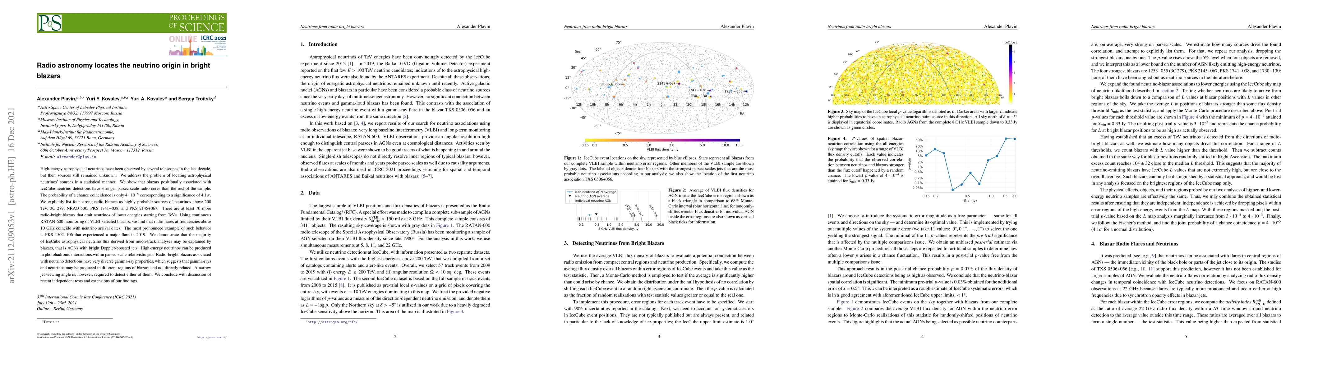 High-energy astrophysical neutrinos have been observed by several telescopes in the last decade, but their sources still remained unknown. We address the problem of locating astrophysical neutrinos' sources in a statistical manner. We show that blazars positionally associated with IceCube neutrino detections have stronger parsec-scale radio cores than the rest of the sample. The probability of a chance coincidence is only 4*10^-5 corresponding to a significance of 4.1 sigma. We explicitly list four strong radio blazars as highly probable sources of neutrinos above 200 TeV: 3C 279, NRAO 530, PKS 1741-038, and PKS 2145+067. There are at least 70 more radio-bright blazars that emit neutrinos of lower energies, starting from TeVs. Using continuous RATAN-600 monitoring of VLBI-selected blazars, we find that radio flares at frequencies above 10 GHz coincide with neutrino arrival dates. The most pronounced example of such behavior is PKS 1502+106 that experienced a major flare in 2019. We demonstrate that the majority of IceCube astrophysical neutrino flux derived from muon-track analyses may be explained by blazars, that is, AGNs with bright Doppler-boosted jets. High-energy neutrinos can be produced in photohadronic interactions within parsec-scale relativistic jets. Radio-bright blazars associated with neutrino detections have very diverse gamma-ray properties, which suggests that gamma-rays and neutrinos may be produced in different regions of blazars and not directly related. A narrow jet viewing angle is, however, required to detect either of them. We conclude with discussion of recent independent tests and extensions of our findings.