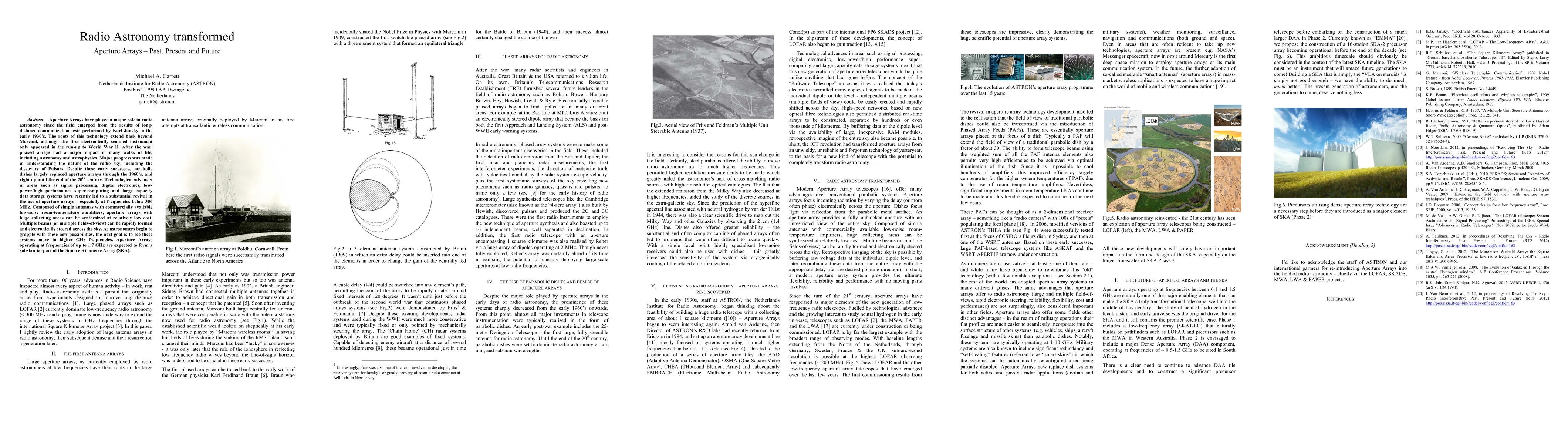 This paper explores the evolution of aperture arrays in radio astronomy, highlighting their historical significance, decline in favor of parabolic dishes, and recent resurgence due to technological advancements. It anticipates future applications, including their integration into the Square Kilometre Array at higher GHz frequencies.
