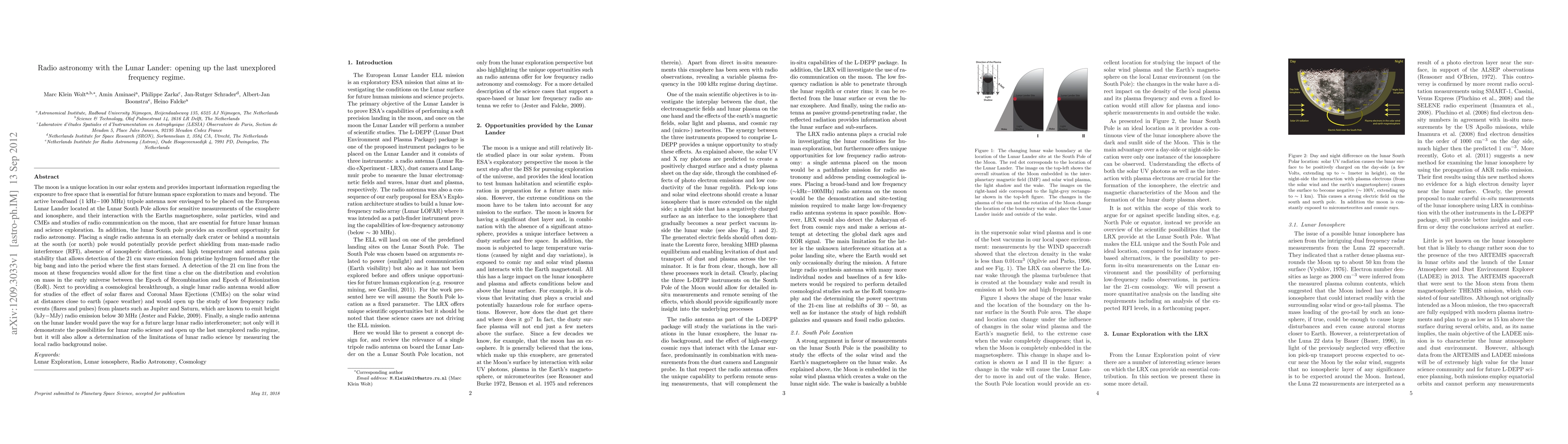 The active broadband (1 kHz-100 MHz) tripole antenna now envisaged to be placed on the European Lunar Lander located at the Lunar South Pole allows for sensitive measurements of the exosphere and ionosphere, and their interaction with the Earths magnetosphere, solar particles, wind and CMEs and studies of radio communication on the moon, that are essential for future lunar human and science exploration. In addition, the lunar South pole provides an excellent opportunity for radio astronomy. Placing a single radio antenna in an eternally dark crater or behind a mountain at the south (or north) pole would potentially provide perfect shielding from man-made radio interference (RFI), absence of ionospheric distortions, and high temperature and antenna gain stability that allows detection of the 21 cm wave emission from pristine hydrogen formed after the big bang and into the period where the first stars formed. A detection of the 21 cm line from the moon at these frequencies would allow for the first time a clue on the distribution and evolution on mass in the early universe between the Epoch of Recombination and Epoch of Reionization (EoR). A single lunar radio antenna would also allow for studies of the effect of solar flares and Coronal Mass Ejections (CMEs) on the solar wind at distances close to earth (space weather) and would open up the study of low frequency radio events from planets such as Jupiter and Saturn, which are known to emit bright (kJy-MJy) radio emission below 30 MHz (Jester & Falcke, 2009). Finally, a single radio antenna on the lunar lander would pave the way for a future large lunar radio interferometer; not only will it demonstrate the possibilities for lunar radio science and open up the last unexplored radio regime, but it will also allow a determination of the limitations of lunar radio science by measuring the local radio background noise.